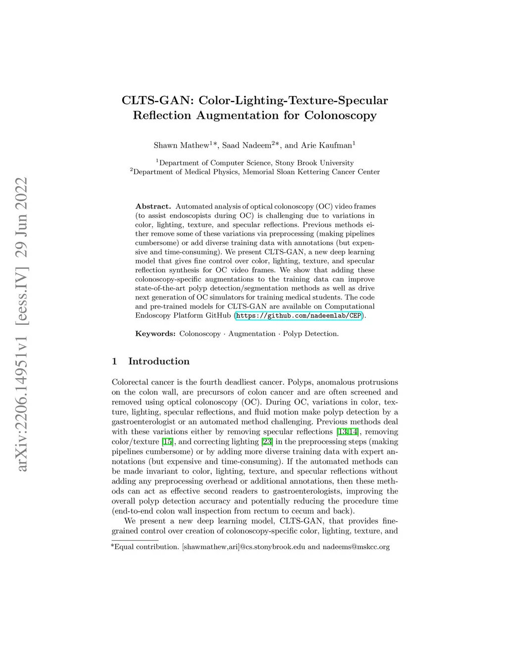 Automated analysis of optical colonoscopy (OC) video frames (to assist endoscopists during OC) is challenging due to variations in color, lighting, texture, and specular reflections. Previous methods either remove some of these variations via preprocessing (making pipelines cumbersome) or add diverse training data with annotations (but expensive and time-consuming). We present CLTS-GAN, a new deep learning model that gives fine control over color, lighting, texture, and specular reflection synthesis for OC video frames. We show that adding these colonoscopy-specific augmentations to the training data can improve state-of-the-art polyp detection/segmentation methods as well as drive next generation of OC simulators for training medical students. The code and pre-trained models for CLTS-GAN are available on Computational Endoscopy Platform GitHub (https://github.com/nadeemlab/CEP).