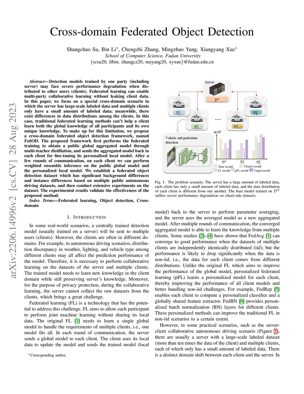 Detection models trained by one party (including server) may face severe performance degradation when distributed to other users (clients). Federated learning can enable multi-party collaborative learning without leaking client data. In this paper, we focus on a special cross-domain scenario in which the server has large-scale labeled data and multiple clients only have a small amount of labeled data; meanwhile, there exist differences in data distributions among the clients. In this case, traditional federated learning methods can't help a client learn both the global knowledge of all participants and its own unique knowledge. To make up for this limitation, we propose a cross-domain federated object detection framework, named FedOD. The proposed framework first performs the federated training to obtain a public global aggregated model through multi-teacher distillation, and sends the aggregated model back to each client for fine-tuning its personalized local model. After a few rounds of communication, on each client we can perform weighted ensemble inference on the public global model and the personalized local model. We establish a federated object detection dataset which has significant background differences and instance differences based on multiple public autonomous driving datasets, and then conduct extensive experiments on the dataset. The experimental results validate the effectiveness of the proposed method.