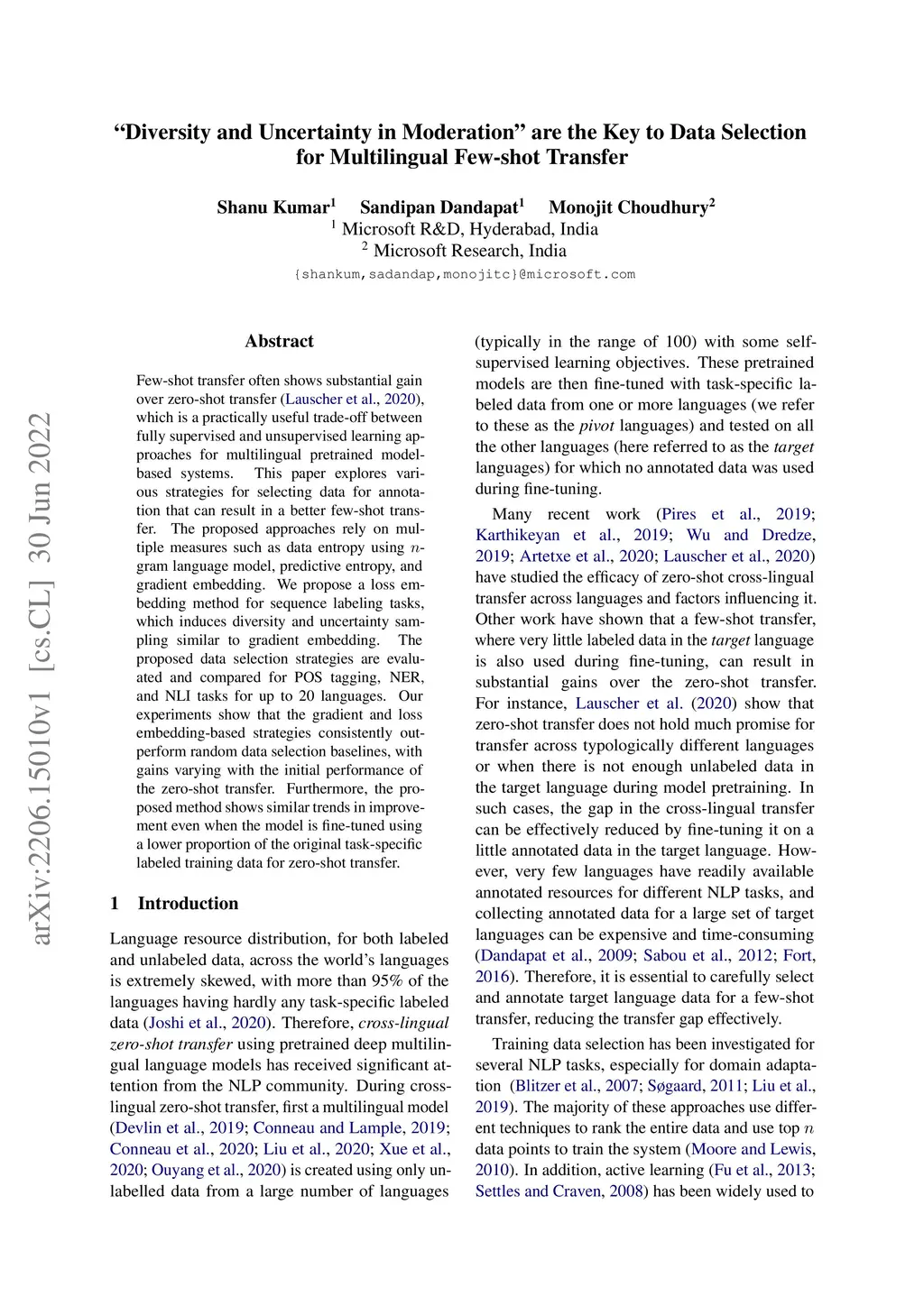 Few-shot transfer often shows substantial gain over zero-shot transfer~\cite{lauscher2020zero}, which is a practically useful trade-off between fully supervised and unsupervised learning approaches for multilingual pretrained model-based systems. This paper explores various strategies for selecting data for annotation that can result in a better few-shot transfer. The proposed approaches rely on multiple measures such as data entropy using -gram language model, predictive entropy, and gradient embedding. We propose a loss embedding method for sequence labeling tasks, which induces diversity and uncertainty sampling similar to gradient embedding. The proposed data selection strategies are evaluated and compared for POS tagging, NER, and NLI tasks for up to 20 languages. Our experiments show that the gradient and loss embedding-based strategies consistently outperform random data selection baselines, with gains varying with the initial performance of the zero-shot transfer. Furthermore, the proposed method shows similar trends in improvement even when the model is fine-tuned using a lower proportion of the original task-specific labeled training data for zero-shot transfer.