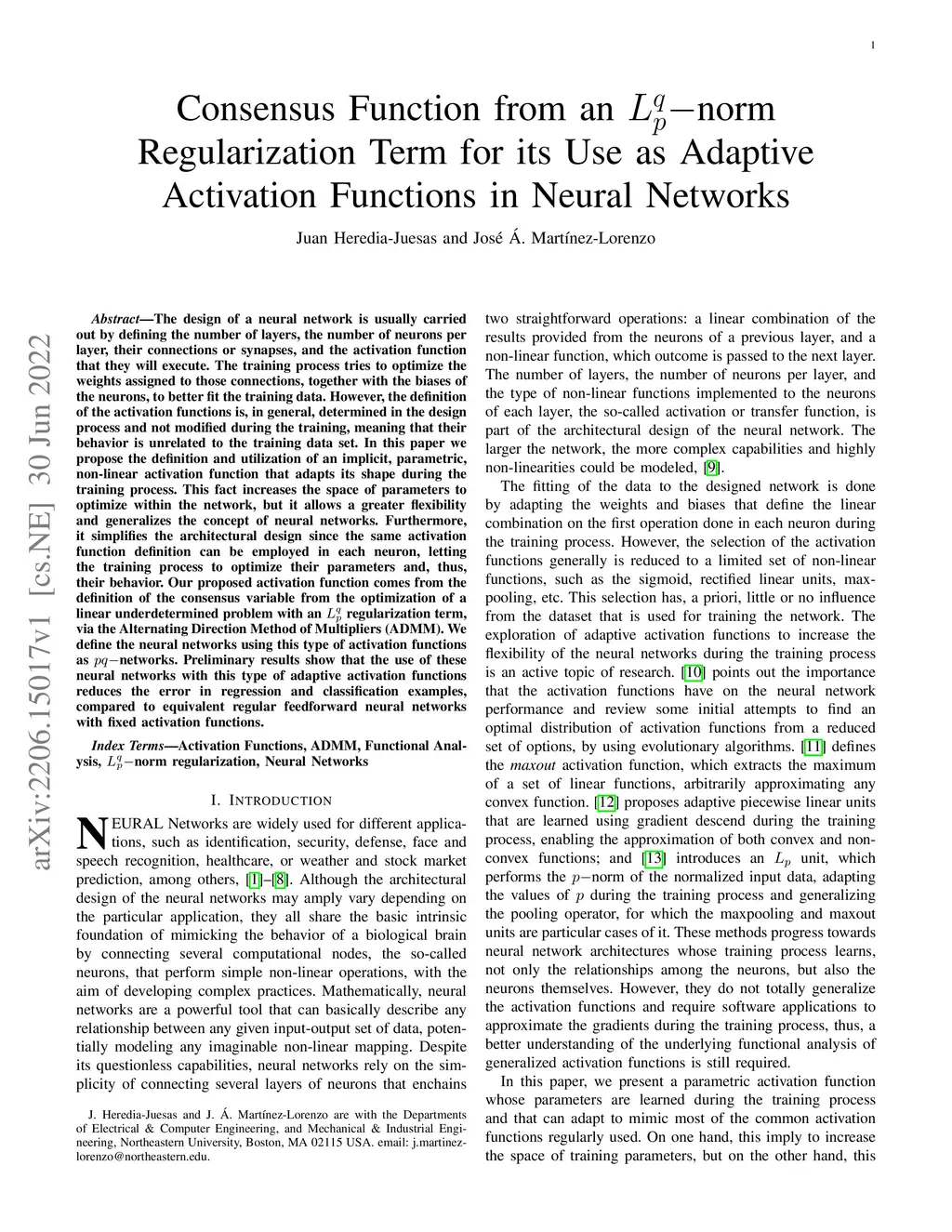The design of a neural network is usually carried out by defining the number of layers, the number of neurons per layer, their connections or synapses, and the activation function that they will execute. The training process tries to optimize the weights assigned to those connections, together with the biases of the neurons, to better fit the training data. However, the definition of the activation functions is, in general, determined in the design process and not modified during the training, meaning that their behavior is unrelated to the training data set. In this paper we propose the definition and utilization of an implicit, parametric, non-linear activation function that adapts its shape during the training process. This fact increases the space of parameters to optimize within the network, but it allows a greater flexibility and generalizes the concept of neural networks. Furthermore, it simplifies the architectural design since the same activation function definition can be employed in each neuron, letting the training process to optimize their parameters and, thus, their behavior. Our proposed activation function comes from the definition of the consensus variable from the optimization of a linear underdetermined problem with an regularization term, via the Alternating Direction Method of Multipliers (ADMM). We define the neural networks using this type of activation functions as networks. Preliminary results show that the use of these neural networks with this type of adaptive activation functions reduces the error in regression and classification examples, compared to equivalent regular feedforward neural networks with fixed activation functions.