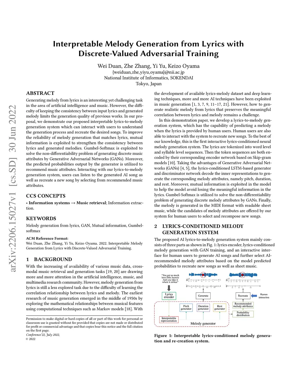 Generating melody from lyrics is an interesting yet challenging task in the area of artificial intelligence and music. However, the difficulty of keeping the consistency between input lyrics and generated melody limits the generation quality of previous works. In our proposal, we demonstrate our proposed interpretable lyrics-to-melody generation system which can interact with users to understand the generation process and recreate the desired songs. To improve the reliability of melody generation that matches lyrics, mutual information is exploited to strengthen the consistency between lyrics and generated melodies. Gumbel-Softmax is exploited to solve the non-differentiability problem of generating discrete music attributes by Generative Adversarial Networks (GANs). Moreover, the predicted probabilities output by the generator is utilized to recommend music attributes. Interacting with our lyrics-to-melody generation system, users can listen to the generated AI song as well as recreate a new song by selecting from recommended music attributes.