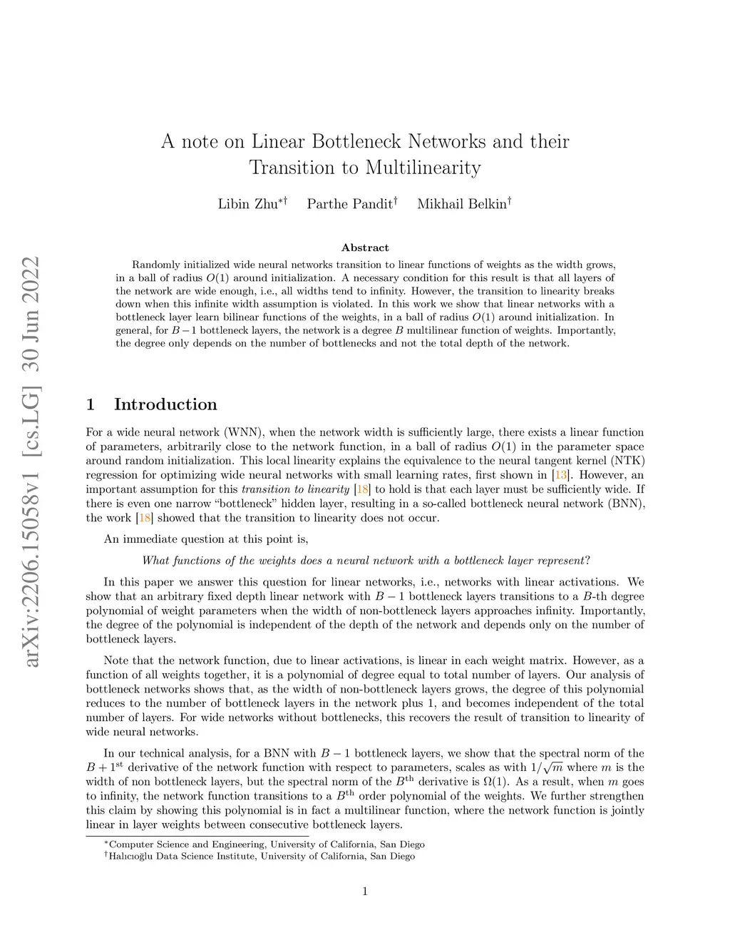 Randomly initialized wide neural networks transition to linear functions of weights as the width grows, in a ball of radius around initialization. A necessary condition for this result is that all layers of the network are wide enough, i.e., all widths tend to infinity. However, the transition to linearity breaks down when this infinite width assumption is violated. In this work we show that linear networks with a bottleneck layer learn bilinear functions of the weights, in a ball of radius around initialization. In general, for bottleneck layers, the network is a degree multilinear function of weights. Importantly, the degree only depends on the number of bottlenecks and not the total depth of the network.