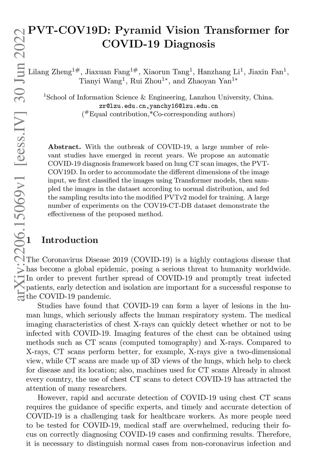 With the outbreak of COVID-19, a large number of relevant studies have emerged in recent years. We propose an automatic COVID-19 diagnosis framework based on lung CT scan images, the PVT-COV19D. In order to accommodate the different dimensions of the image input, we first classified the images using Transformer models, then sampled the images in the dataset according to normal distribution, and fed the sampling results into the modified PVTv2 model for training. A large number of experiments on the COV19-CT-DB dataset demonstrate the effectiveness of the proposed method.