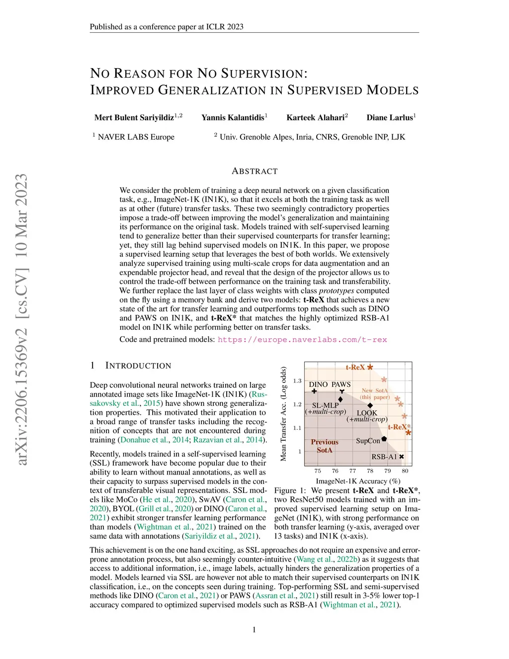 We consider the problem of training a deep neural network on a given classification task, e.g., ImageNet-1K (IN1K), so that it excels at both the training task as well as at other (future) transfer tasks. These two seemingly contradictory properties impose a trade-off between improving the model's generalization and maintaining its performance on the original task. Models trained with self-supervised learning tend to generalize better than their supervised counterparts for transfer learning; yet, they still lag behind supervised models on IN1K. In this paper, we propose a supervised learning setup that leverages the best of both worlds. We extensively analyze supervised training using multi-scale crops for data augmentation and an expendable projector head, and reveal that the design of the projector allows us to control the trade-off between performance on the training task and transferability. We further replace the last layer of class weights with class prototypes computed on the fly using a memory bank and derive two models: t-ReX that achieves a new state of the art for transfer learning and outperforms top methods such as DINO and PAWS on IN1K, and t-ReX* that matches the highly optimized RSB-A1 model on IN1K while performing better on transfer tasks. Code and pretrained models: https://europe.naverlabs.com/t-rex
