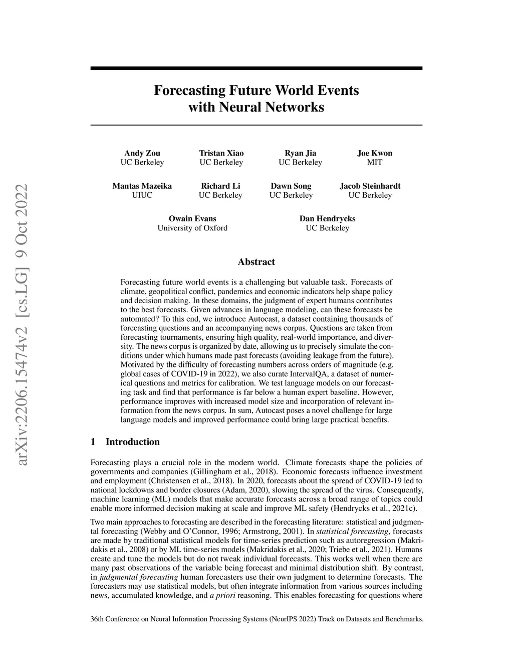 Forecasting future world events is a challenging but valuable task. Forecasts of climate, geopolitical conflict, pandemics and economic indicators help shape policy and decision making. In these domains, the judgment of expert humans contributes to the best forecasts. Given advances in language modeling, can these forecasts be automated? To this end, we introduce Autocast, a dataset containing thousands of forecasting questions and an accompanying news corpus. Questions are taken from forecasting tournaments, ensuring high quality, real-world importance, and diversity. The news corpus is organized by date, allowing us to precisely simulate the conditions under which humans made past forecasts (avoiding leakage from the future). Motivated by the difficulty of forecasting numbers across orders of magnitude (e.g. global cases of COVID-19 in 2022), we also curate IntervalQA, a dataset of numerical questions and metrics for calibration. We test language models on our forecasting task and find that performance is far below a human expert baseline. However, performance improves with increased model size and incorporation of relevant information from the news corpus. In sum, Autocast poses a novel challenge for large language models and improved performance could bring large practical benefits.