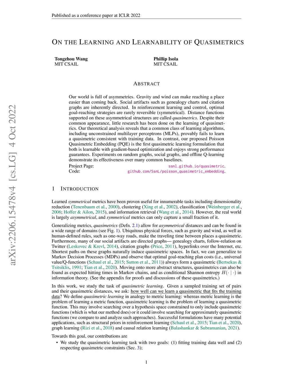 Our world is full of asymmetries. Gravity and wind can make reaching a place easier than coming back. Social artifacts such as genealogy charts and citation graphs are inherently directed. In reinforcement learning and control, optimal goal-reaching strategies are rarely reversible (symmetrical). Distance functions supported on these asymmetrical structures are called quasimetrics. Despite their common appearance, little research has been done on the learning of quasimetrics. Our theoretical analysis reveals that a common class of learning algorithms, including unconstrained multilayer perceptrons (MLPs), provably fails to learn a quasimetric consistent with training data. In contrast, our proposed Poisson Quasimetric Embedding (PQE) is the first quasimetric learning formulation that both is learnable with gradient-based optimization and enjoys strong performance guarantees. Experiments on random graphs, social graphs, and offline Q-learning demonstrate its effectiveness over many common baselines.