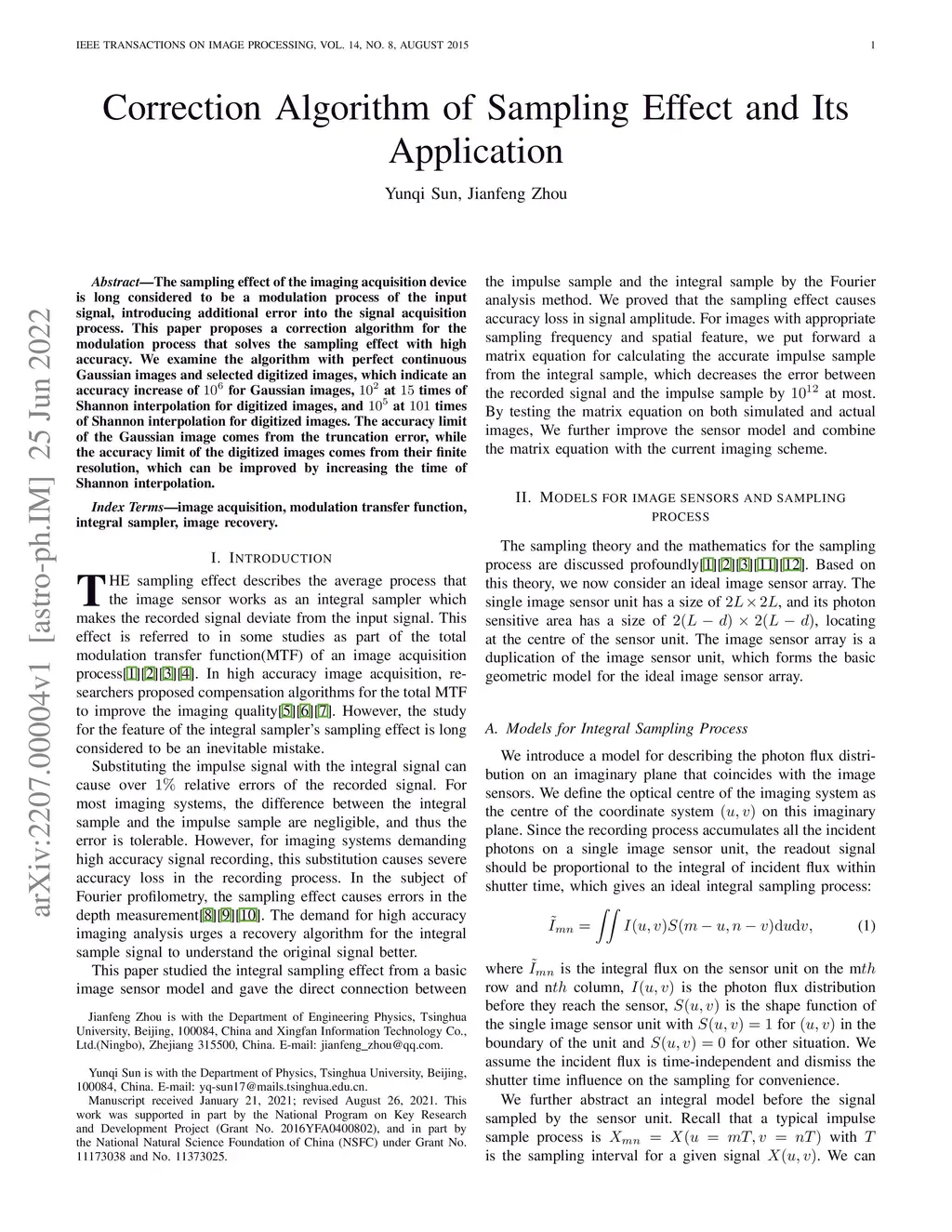 The sampling effect of the imaging acquisition device is long considered to be a modulation process of the input signal, introducing additional error into the signal acquisition process. This paper proposes a correction algorithm for the modulation process that solves the sampling effect with high accuracy. We examine the algorithm with perfect continuous Gaussian images and selected digitized images, which indicate an accuracy increase of 106 for Gaussian images, 102 at 15 times of Shannon interpolation for digitized images, and 105 at 101 times of Shannon interpolation for digitized images. The accuracy limit of the Gaussian image comes from the truncation error, while the accuracy limit of the digitized images comes from their finite resolution, which can be improved by increasing the time of Shannon interpolation.