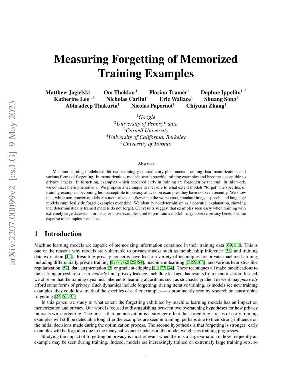 Machine learning models exhibit two seemingly contradictory phenomena: training data memorization, and various forms of forgetting. In memorization, models overfit specific training examples and become susceptible to privacy attacks. In forgetting, examples which appeared early in training are forgotten by the end. In this work, we connect these phenomena. We propose a technique to measure to what extent models "forget" the specifics of training examples, becoming less susceptible to privacy attacks on examples they have not seen recently. We show that, while non-convex models can memorize data forever in the worst-case, standard image, speech, and language models empirically do forget examples over time. We identify nondeterminism as a potential explanation, showing that deterministically trained models do not forget. Our results suggest that examples seen early when training with extremely large datasets - for instance those examples used to pre-train a model - may observe privacy benefits at the expense of examples seen later.