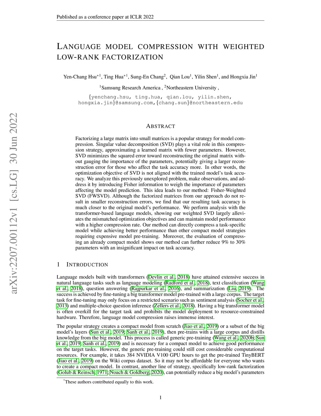 Factorizing a large matrix into small matrices is a popular strategy for model compression. Singular value decomposition (SVD) plays a vital role in this compression strategy, approximating a learned matrix with fewer parameters. However, SVD minimizes the squared error toward reconstructing the original matrix without gauging the importance of the parameters, potentially giving a larger reconstruction error for those who affect the task accuracy more. In other words, the optimization objective of SVD is not aligned with the trained model's task accuracy. We analyze this previously unexplored problem, make observations, and address it by introducing Fisher information to weigh the importance of parameters affecting the model prediction. This idea leads to our method: Fisher-Weighted SVD (FWSVD). Although the factorized matrices from our approach do not result in smaller reconstruction errors, we find that our resulting task accuracy is much closer to the original model's performance. We perform analysis with the transformer-based language models, showing our weighted SVD largely alleviates the mismatched optimization objectives and can maintain model performance with a higher compression rate. Our method can directly compress a task-specific model while achieving better performance than other compact model strategies requiring expensive model pre-training. Moreover, the evaluation of compressing an already compact model shows our method can further reduce 9% to 30% parameters with an insignificant impact on task accuracy.
