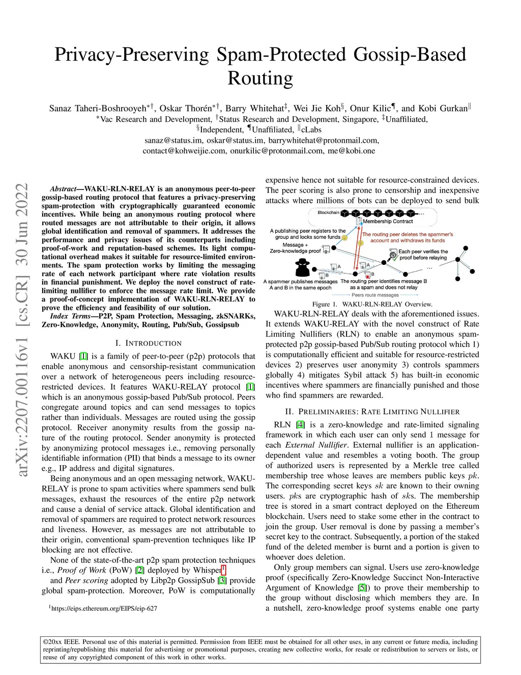 WAKU-RLN-RELAY is an anonymous peer-to-peer gossip-based routing protocol that features a privacy-preserving spam-protection with cryptographically guaranteed economic incentives. While being an anonymous routing protocol where routed messages are not attributable to their origin, it allows global identification and removal of spammers. It addresses the performance and privacy issues of its counterparts including proof-of-work and reputation-based schemes. Its light computational overhead makes it suitable for resource-limited environments. The spam protection works by limiting the messaging rate of each network participant where rate violation results in financial punishment. We deploy the novel construct of rate-limiting nullifier to enforce the message rate limit. We provide a proof-of-concept implementation of WAKU-RLN-RELAY to prove the efficiency and feasibility of our solution.