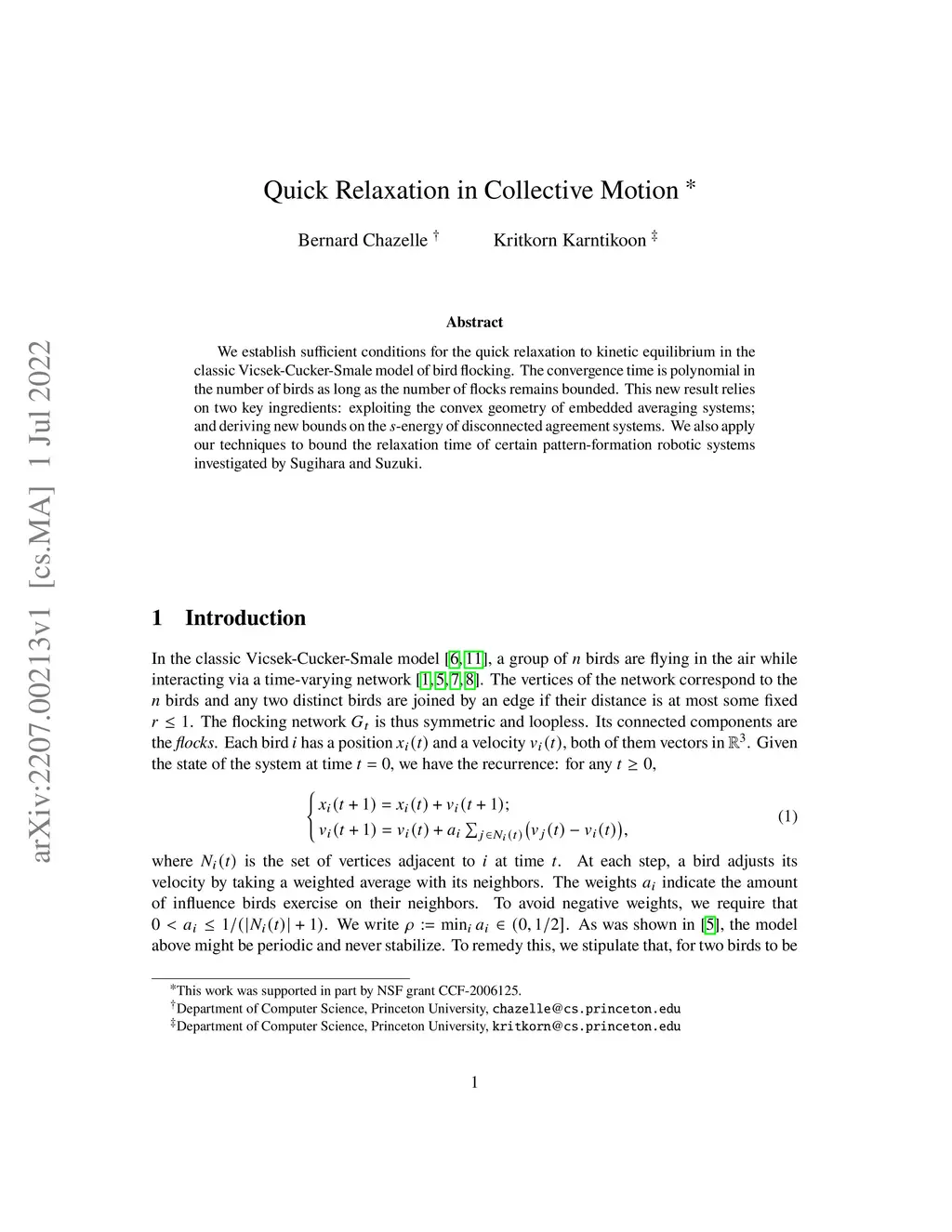 We establish sufficient conditions for the quick relaxation to kinetic equilibrium in the classic Vicsek-Cucker-Smale model of bird flocking. The convergence time is polynomial in the number of birds as long as the number of flocks remains bounded. This new result relies on two key ingredients: exploiting the convex geometry of embedded averaging systems; and deriving new bounds on the s-energy of disconnected agreement systems. We also apply our techniques to bound the relaxation time of certain pattern-formation robotic systems investigated by Sugihara and Suzuki.