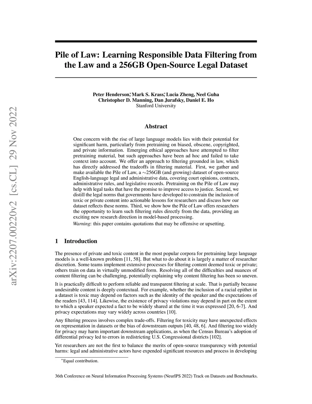 Pile of Law: Learning Responsible Data Filtering from the Law and a