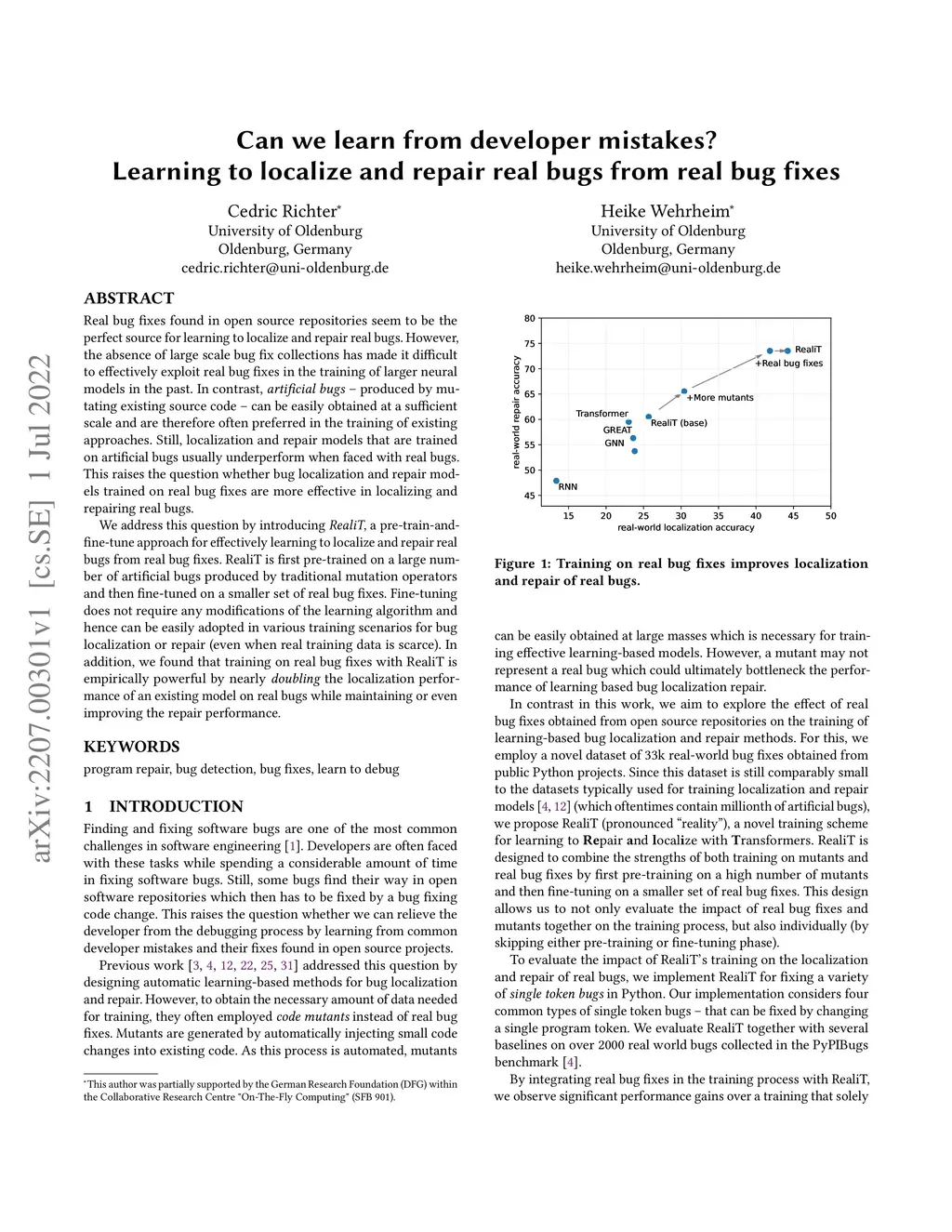 Real bug fixes found in open source repositories seem to be the perfect source for learning to localize and repair real bugs. However, the absence of large scale bug fix collections has made it difficult to effectively exploit real bug fixes in the training of larger neural models in the past. In contrast, artificial bugs -- produced by mutating existing source code -- can be easily obtained at a sufficient scale and are therefore often preferred in the training of existing approaches. Still, localization and repair models that are trained on artificial bugs usually underperform when faced with real bugs. This raises the question whether bug localization and repair models trained on real bug fixes are more effective in localizing and repairing real bugs. We address this question by introducing RealiT, a pre-train-and-fine-tune approach for effectively learning to localize and repair real bugs from real bug fixes. RealiT is first pre-trained on a large number of artificial bugs produced by traditional mutation operators and then fine-tuned on a smaller set of real bug fixes. Fine-tuning does not require any modifications of the learning algorithm and hence can be easily adopted in various training scenarios for bug localization or repair (even when real training data is scarce). In addition, we found that training on real bug fixes with RealiT is empirically powerful by nearly doubling the localization performance of an existing model on real bugs while maintaining or even improving the repair performance.