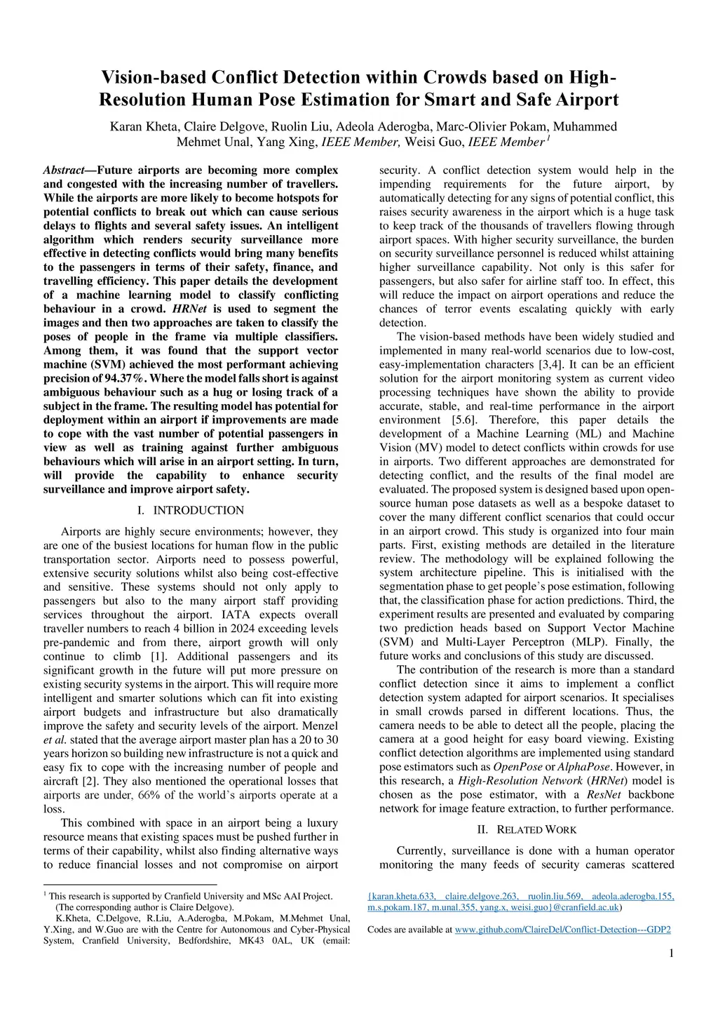 Future airports are becoming more complex and congested with the increasing number of travellers. While the airports are more likely to become hotspots for potential conflicts to break out which can cause serious delays to flights and several safety issues. An intelligent algorithm which renders security surveillance more effective in detecting conflicts would bring many benefits to the passengers in terms of their safety, finance, and travelling efficiency. This paper details the development of a machine learning model to classify conflicting behaviour in a crowd. HRNet is used to segment the images and then two approaches are taken to classify the poses of people in the frame via multiple classifiers. Among them, it was found that the support vector machine (SVM) achieved the most performant achieving precision of 94.37%. Where the model falls short is against ambiguous behaviour such as a hug or losing track of a subject in the frame. The resulting model has potential for deployment within an airport if improvements are made to cope with the vast number of potential passengers in view as well as training against further ambiguous behaviours which will arise in an airport setting. In turn, will provide the capability to enhance security surveillance and improve airport safety.