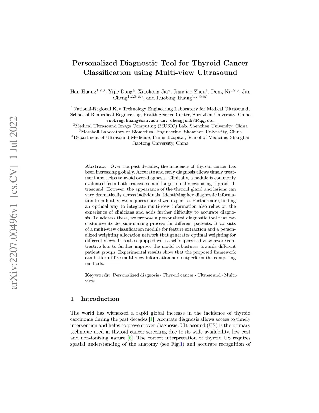 Over the past decades, the incidence of thyroid cancer has been increasing globally. Accurate and early diagnosis allows timely treatment and helps to avoid over-diagnosis. Clinically, a nodule is commonly evaluated from both transverse and longitudinal views using thyroid ultrasound. However, the appearance of the thyroid gland and lesions can vary dramatically across individuals. Identifying key diagnostic information from both views requires specialized expertise. Furthermore, finding an optimal way to integrate multi-view information also relies on the experience of clinicians and adds further difficulty to accurate diagnosis. To address these, we propose a personalized diagnostic tool that can customize its decision-making process for different patients. It consists of a multi-view classification module for feature extraction and a personalized weighting allocation network that generates optimal weighting for different views. It is also equipped with a self-supervised view-aware contrastive loss to further improve the model robustness towards different patient groups. Experimental results show that the proposed framework can better utilize multi-view information and outperform the competing methods.