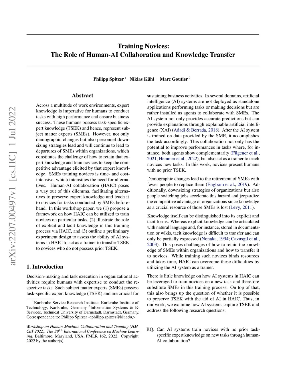 Across a multitude of work environments, expert knowledge is imperative for humans to conduct tasks with high performance and ensure business success. These humans possess task-specific expert knowledge (TSEK) and hence, represent subject matter experts (SMEs). However, not only demographic changes but also personnel downsizing strategies lead and will continue to lead to departures of SMEs within organizations, which constitutes the challenge of how to retain that expert knowledge and train novices to keep the competitive advantage elicited by that expert knowledge. SMEs training novices is time- and cost-intensive, which intensifies the need for alternatives. Human-AI collaboration (HAIC) poses a way out of this dilemma, facilitating alternatives to preserve expert knowledge and teach it to novices for tasks conducted by SMEs beforehand. In this workshop paper, we (1) propose a framework on how HAIC can be utilized to train novices on particular tasks, (2) illustrate the role of explicit and tacit knowledge in this training process via HAIC, and (3) outline a preliminary experiment design to assess the ability of AI systems in HAIC to act as a trainer to transfer TSEK to novices who do not possess prior TSEK.