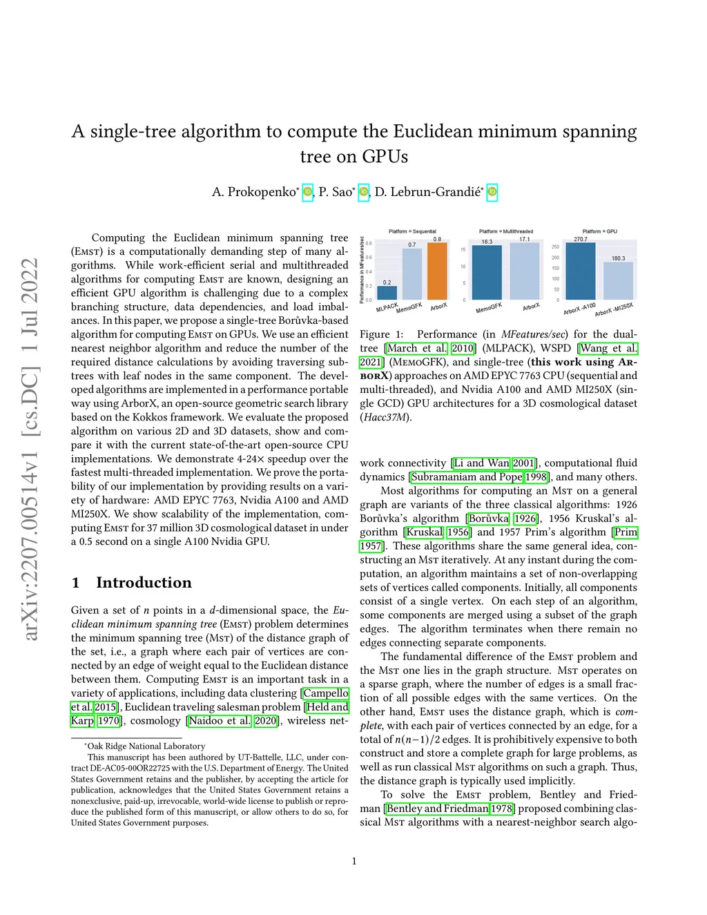 Computing the Euclidean minimum spanning tree (EMST) is a computationally demanding step of many algorithms. While work-efficient serial and multithreaded algorithms for computing EMST are known, designing an efficient GPU algorithm is challenging due to a complex branching structure, data dependencies, and load imbalances. In this paper, we propose a single-tree Bor\r{u}vka-based algorithm for computing EMST on GPUs. We use an efficient nearest neighbor algorithm and reduce the number of the required distance calculations by avoiding traversing subtrees with leaf nodes in the same component. The developed algorithms are implemented in a performance portable way using ArborX, an open-source geometric search library based on the Kokkos framework. We evaluate the proposed algorithm on various 2D and 3D datasets, show and compare it with the current state-of-the-art open-source CPU implementations. We demonstrate 4-24x speedup over the fastest multi-threaded implementation. We prove the portability of our implementation by providing results on a variety of hardware: AMD EPYC 7763, Nvidia A100 and AMD MI250X. We show scalability of the implementation, computing EMST for 37 million 3D cosmological dataset in under a 0.5 second on a single A100 Nvidia GPU.