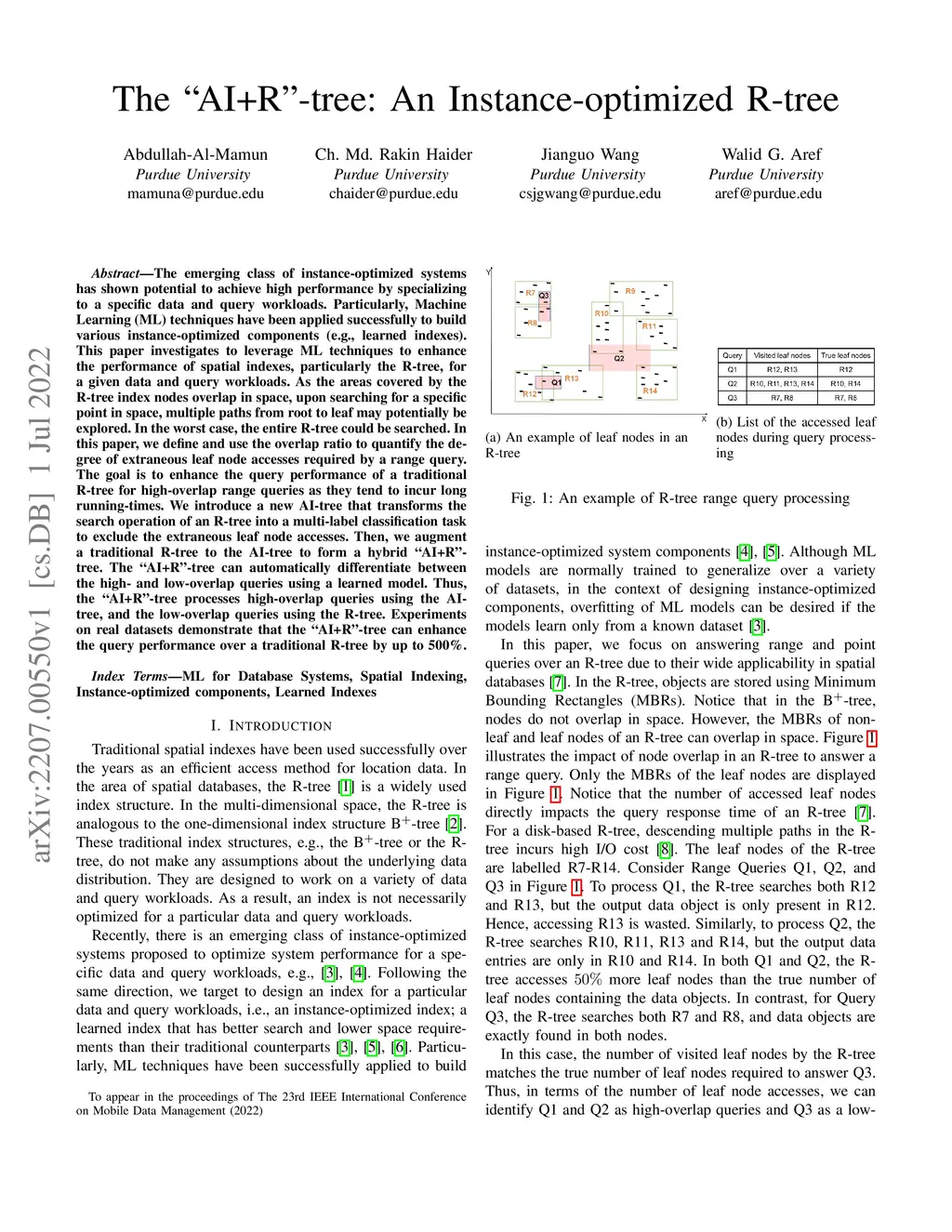 The emerging class of instance-optimized systems has shown potential to achieve high performance by specializing to a specific data and query workloads. Particularly, Machine Learning (ML) techniques have been applied successfully to build various instance-optimized components (e.g., learned indexes). This paper investigates to leverage ML techniques to enhance the performance of spatial indexes, particularly the R-tree, for a given data and query workloads. As the areas covered by the R-tree index nodes overlap in space, upon searching for a specific point in space, multiple paths from root to leaf may potentially be explored. In the worst case, the entire R-tree could be searched. In this paper, we define and use the overlap ratio to quantify the degree of extraneous leaf node accesses required by a range query. The goal is to enhance the query performance of a traditional R-tree for high-overlap range queries as they tend to incur long running-times. We introduce a new AI-tree that transforms the search operation of an R-tree into a multi-label classification task to exclude the extraneous leaf node accesses. Then, we augment a traditional R-tree to the AI-tree to form a hybrid "AI+R"-tree. The "AI+R"-tree can automatically differentiate between the high- and low-overlap queries using a learned model. Thus, the "AI+R"-tree processes high-overlap queries using the AI-tree, and the low-overlap queries using the R-tree. Experiments on real datasets demonstrate that the "AI+R"-tree can enhance the query performance over a traditional R-tree by up to 500%.