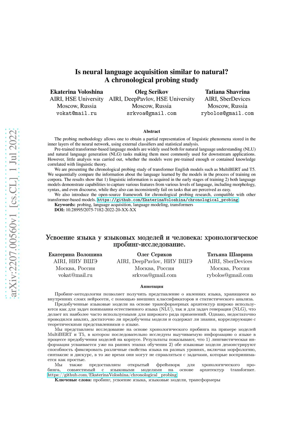 The probing methodology allows one to obtain a partial representation of linguistic phenomena stored in the inner layers of the neural network, using external classifiers and statistical analysis. Pre-trained transformer-based language models are widely used both for natural language understanding (NLU) and natural language generation (NLG) tasks making them most commonly used for downstream applications. However, little analysis was carried out, whether the models were pre-trained enough or contained knowledge correlated with linguistic theory. We are presenting the chronological probing study of transformer English models such as MultiBERT and T5. We sequentially compare the information about the language learned by the models in the process of training on corpora. The results show that 1) linguistic information is acquired in the early stages of training 2) both language models demonstrate capabilities to capture various features from various levels of language, including morphology, syntax, and even discourse, while they also can inconsistently fail on tasks that are perceived as easy. We also introduce the open-source framework for chronological probing research, compatible with other transformer-based models. https://github.com/EkaterinaVoloshina/chronological_probing