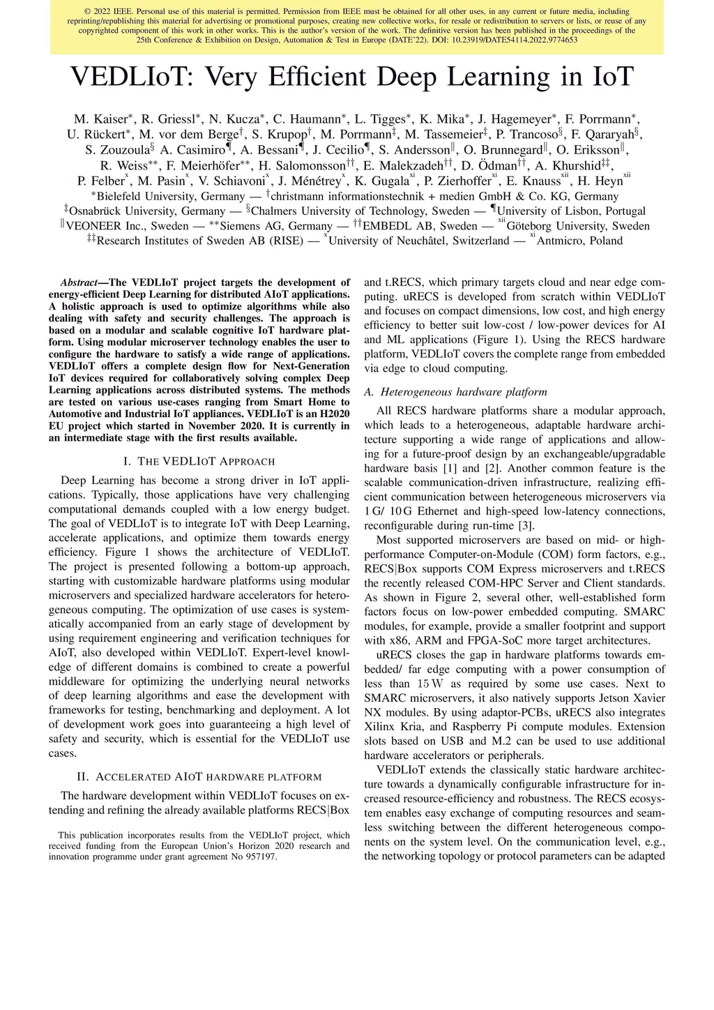 The VEDLIoT project targets the development of energy-efficient Deep Learning for distributed AIoT applications. A holistic approach is used to optimize algorithms while also dealing with safety and security challenges. The approach is based on a modular and scalable cognitive IoT hardware platform. Using modular microserver technology enables the user to configure the hardware to satisfy a wide range of applications. VEDLIoT offers a complete design flow for Next-Generation IoT devices required for collaboratively solving complex Deep Learning applications across distributed systems. The methods are tested on various use-cases ranging from Smart Home to Automotive and Industrial IoT appliances. VEDLIoT is an H2020 EU project which started in November 2020. It is currently in an intermediate stage with the first results available.