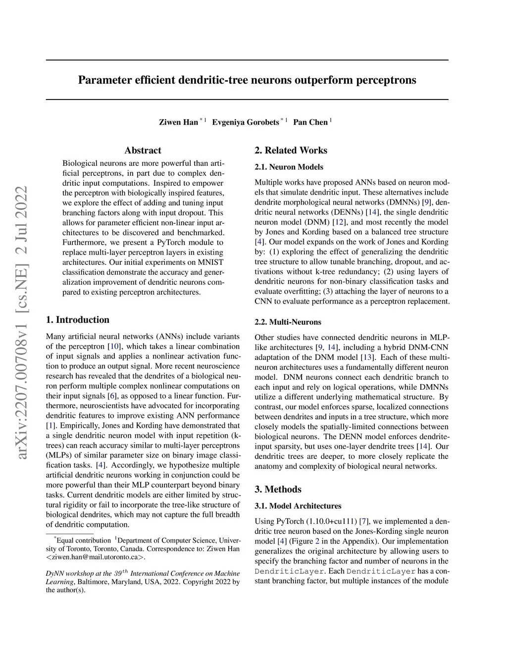 Biological neurons are more powerful than artificial perceptrons, in part due to complex dendritic input computations. Inspired to empower the perceptron with biologically inspired features, we explore the effect of adding and tuning input branching factors along with input dropout. This allows for parameter efficient non-linear input architectures to be discovered and benchmarked. Furthermore, we present a PyTorch module to replace multi-layer perceptron layers in existing architectures. Our initial experiments on MNIST classification demonstrate the accuracy and generalization improvement of dendritic neurons compared to existing perceptron architectures.