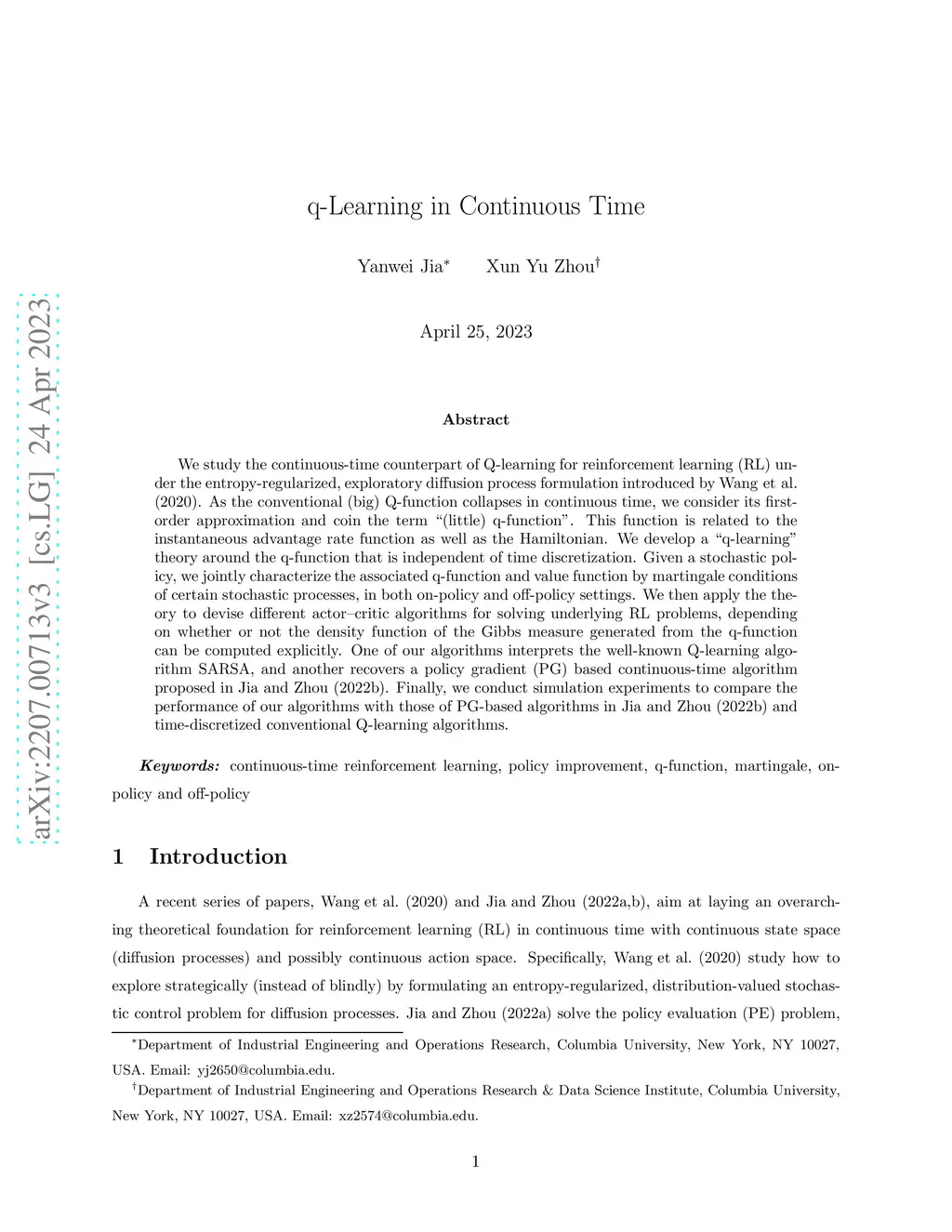 We study the continuous-time counterpart of Q-learning for reinforcement learning (RL) under the entropy-regularized, exploratory diffusion process formulation introduced by Wang et al. (2020). As the conventional (big) Q-function collapses in continuous time, we consider its first-order approximation and coin the term ``(little) q-function". This function is related to the instantaneous advantage rate function as well as the Hamiltonian. We develop a ``q-learning" theory around the q-function that is independent of time discretization. Given a stochastic policy, we jointly characterize the associated q-function and value function by martingale conditions of certain stochastic processes, in both on-policy and off-policy settings. We then apply the theory to devise different actor-critic algorithms for solving underlying RL problems, depending on whether or not the density function of the Gibbs measure generated from the q-function can be computed explicitly. One of our algorithms interprets the well-known Q-learning algorithm SARSA, and another recovers a policy gradient (PG) based continuous-time algorithm proposed in Jia and Zhou (2022b). Finally, we conduct simulation experiments to compare the performance of our algorithms with those of PG-based algorithms in Jia and Zhou (2022b) and time-discretized conventional Q-learning algorithms.