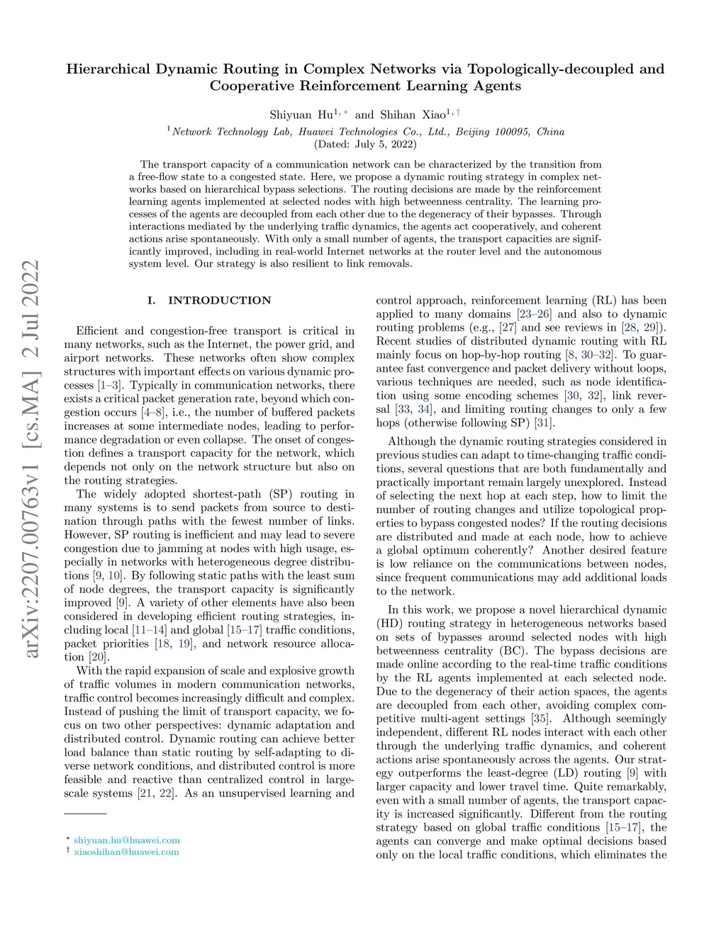 The transport capacity of a communication network can be characterized by the transition from a free-flow state to a congested state. Here, we propose a dynamic routing strategy in complex networks based on hierarchical bypass selections. The routing decisions are made by the reinforcement learning agents implemented at selected nodes with high betweenness centrality. The learning processes of the agents are decoupled from each other due to the degeneracy of their bypasses. Through interactions mediated by the underlying traffic dynamics, the agents act cooperatively, and coherent actions arise spontaneously. With only a small number of agents, the transport capacities are significantly improved, including in real-world Internet networks at the router level and the autonomous system level. Our strategy is also resilient to link removals.