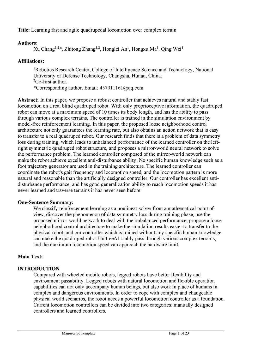 In this paper, we propose a robust controller that achieves natural and stably fast locomotion on a real blind quadruped robot. With only proprioceptive information, the quadruped robot can move at a maximum speed of 10 times its body length, and has the ability to pass through various complex terrains. The controller is trained in the simulation environment by model-free reinforcement learning. In this paper, the proposed loose neighborhood control architecture not only guarantees the learning rate, but also obtains an action network that is easy to transfer to a real quadruped robot. Our research finds that there is a problem of data symmetry loss during training, which leads to unbalanced performance of the learned controller on the left-right symmetric quadruped robot structure, and proposes a mirror-world neural network to solve the performance problem. The learned controller composed of the mirror-world network can make the robot achieve excellent anti-disturbance ability. No specific human knowledge such as a foot trajectory generator are used in the training architecture. The learned controller can coordinate the robot's gait frequency and locomotion speed, and the locomotion pattern is more natural and reasonable than the artificially designed controller. Our controller has excellent anti-disturbance performance, and has good generalization ability to reach locomotion speeds it has never learned and traverse terrains it has never seen before.