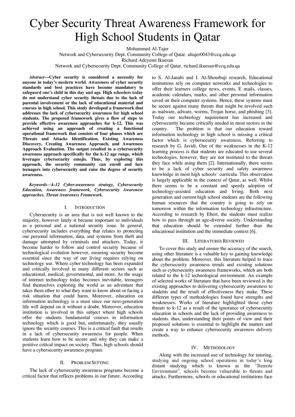 Cyber security is considered a necessity for anyone in todays modern world. Awareness of cyber security standards and best practices have become mandatory to safeguard ones child in this day and age. High schoolers today do not understand cyber security threats due to the lack of parental involvement or the lack of educational material and courses in high school. This study developed a framework that addresses the lack of cybersecurity awareness for high school students. The proposed framework gives a flow of steps to provide effective awareness approaches for k12. This was achieved using an approach of creating a functional operational framework that consists of four phases which are Threats and Attacks Identification, Existing Awareness Discovery, Creating Awareness Approach, and Awareness Approach Evaluation. The output resulted in a cybersecurity awareness approach specifically for the k-12 age range, which leverages cybersecurity emojis. Thus, by exploring this approach, the security community can enroll and lure teenagers into cybersecurity and raise the degree of security awareness.