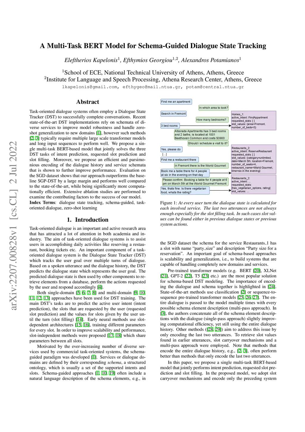 Task-oriented dialogue systems often employ a Dialogue State Tracker (DST) to successfully complete conversations. Recent state-of-the-art DST implementations rely on schemata of diverse services to improve model robustness and handle zero-shot generalization to new domains [1], however such methods [2, 3] typically require multiple large scale transformer models and long input sequences to perform well. We propose a single multi-task BERT-based model that jointly solves the three DST tasks of intent prediction, requested slot prediction and slot filling. Moreover, we propose an efficient and parsimonious encoding of the dialogue history and service schemata that is shown to further improve performance. Evaluation on the SGD dataset shows that our approach outperforms the baseline SGP-DST by a large margin and performs well compared to the state-of-the-art, while being significantly more computationally efficient. Extensive ablation studies are performed to examine the contributing factors to the success of our model.