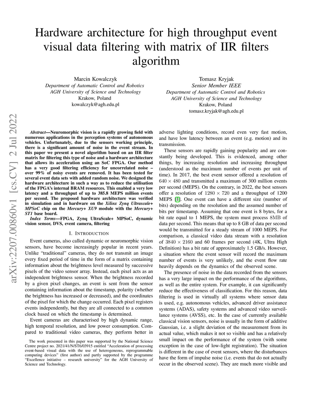Neuromorphic vision is a rapidly growing field with numerous applications in the perception systems of autonomous vehicles. Unfortunately, due to the sensors working principle, there is a significant amount of noise in the event stream. In this paper we present a novel algorithm based on an IIR filter matrix for filtering this type of noise and a hardware architecture that allows its acceleration using an SoC FPGA. Our method has a very good filtering efficiency for uncorrelated noise - over 99% of noisy events are removed. It has been tested for several event data sets with added random noise. We designed the hardware architecture in such a way as to reduce the utilisation of the FPGA's internal BRAM resources. This enabled a very low latency and a throughput of up to 385.8 MEPS million events per second.The proposed hardware architecture was verified in simulation and in hardware on the Xilinx Zynq Ultrascale+ MPSoC chip on the Mercury+ XU9 module with the Mercury+ ST1 base board.