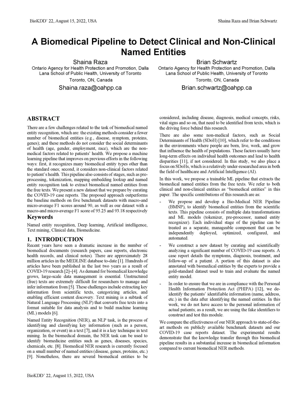 There are a few challenges related to the task of biomedical named entity recognition, which are: the existing methods consider a fewer number of biomedical entities (e.g., disease, symptom, proteins, genes); and these methods do not consider the social determinants of health (age, gender, employment, race), which are the non-medical factors related to patients' health. We propose a machine learning pipeline that improves on previous efforts in the following ways: first, it recognizes many biomedical entity types other than the standard ones; second, it considers non-clinical factors related to patient's health. This pipeline also consists of stages, such as preprocessing, tokenization, mapping embedding lookup and named entity recognition task to extract biomedical named entities from the free texts. We present a new dataset that we prepare by curating the COVID-19 case reports. The proposed approach outperforms the baseline methods on five benchmark datasets with macro-and micro-average F1 scores around 90, as well as our dataset with a macro-and micro-average F1 score of 95.25 and 93.18 respectively.