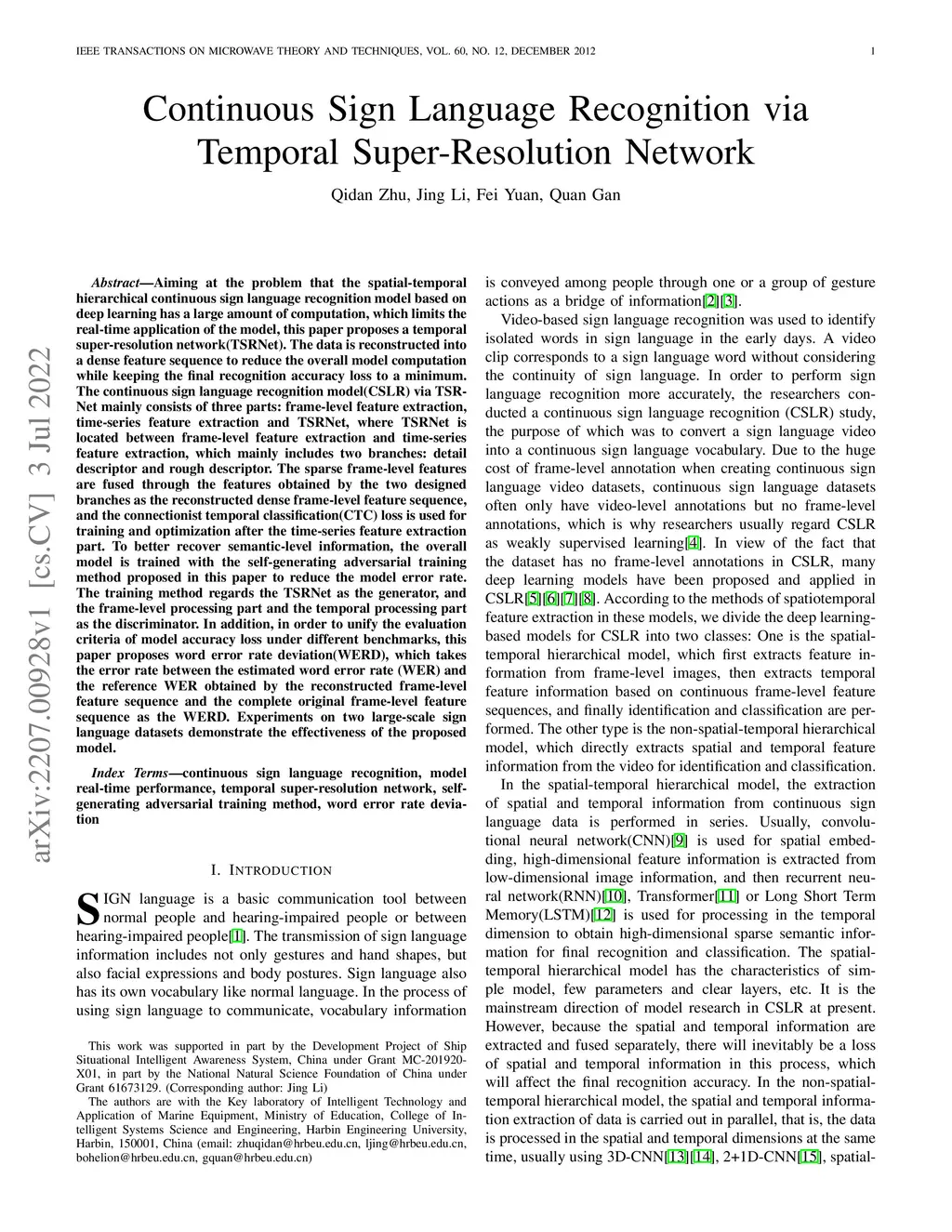 Aiming at the problem that the spatial-temporal hierarchical continuous sign language recognition model based on deep learning has a large amount of computation, which limits the real-time application of the model, this paper proposes a temporal super-resolution network(TSRNet). The data is reconstructed into a dense feature sequence to reduce the overall model computation while keeping the final recognition accuracy loss to a minimum. The continuous sign language recognition model(CSLR) via TSRNet mainly consists of three parts: frame-level feature extraction, time series feature extraction and TSRNet, where TSRNet is located between frame-level feature extraction and time-series feature extraction, which mainly includes two branches: detail descriptor and rough descriptor. The sparse frame-level features are fused through the features obtained by the two designed branches as the reconstructed dense frame-level feature sequence, and the connectionist temporal classification(CTC) loss is used for training and optimization after the time-series feature extraction part. To better recover semantic-level information, the overall model is trained with the self-generating adversarial training method proposed in this paper to reduce the model error rate. The training method regards the TSRNet as the generator, and the frame-level processing part and the temporal processing part as the discriminator. In addition, in order to unify the evaluation criteria of model accuracy loss under different benchmarks, this paper proposes word error rate deviation(WERD), which takes the error rate between the estimated word error rate (WER) and the reference WER obtained by the reconstructed frame-level feature sequence and the complete original frame-level feature sequence as the WERD. Experiments on two large-scale sign language datasets demonstrate the effectiveness of the proposed model.
