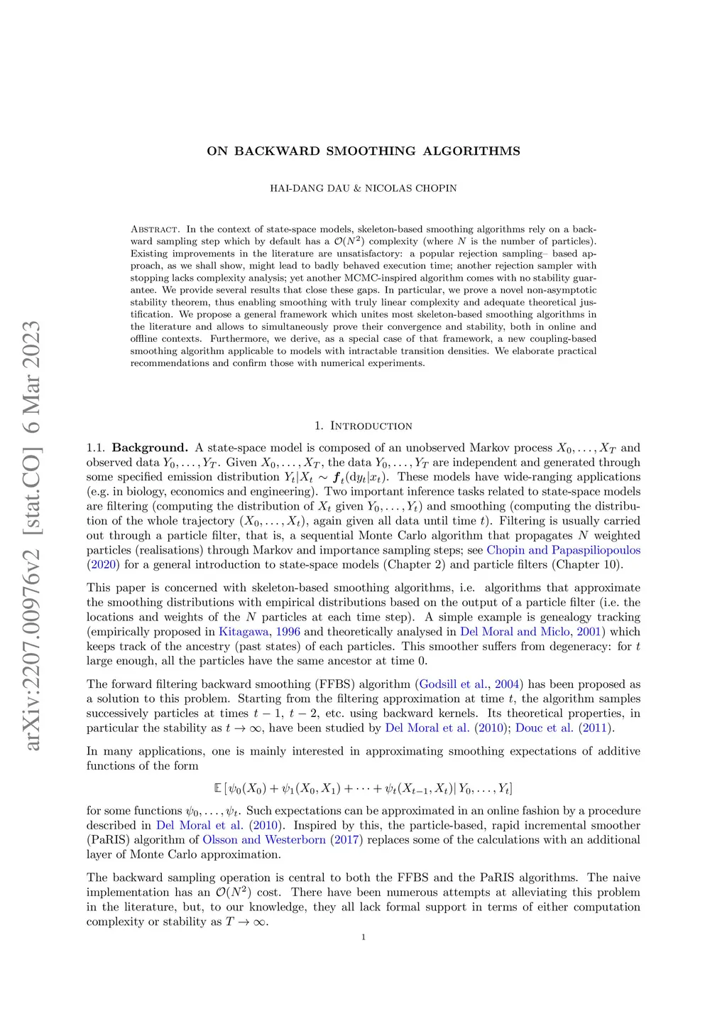 In the context of state-space models, skeleton-based smoothing algorithms rely on a backward sampling step which by default has a complexity (where is the number of particles). Existing improvements in the literature are unsatisfactory: a popular rejection sampling -- based approach, as we shall show, might lead to badly behaved execution time; another rejection sampler with stopping lacks complexity analysis; yet another MCMC-inspired algorithm comes with no stability guarantee. We provide several results that close these gaps. In particular, we prove a novel non-asymptotic stability theorem, thus enabling smoothing with truly linear complexity and adequate theoretical justification. We propose a general framework which unites most skeleton-based smoothing algorithms in the literature and allows to simultaneously prove their convergence and stability, both in online and offline contexts. Furthermore, we derive, as a special case of that framework, a new coupling-based smoothing algorithm applicable to models with intractable transition densities. We elaborate practical recommendations and confirm those with numerical experiments.