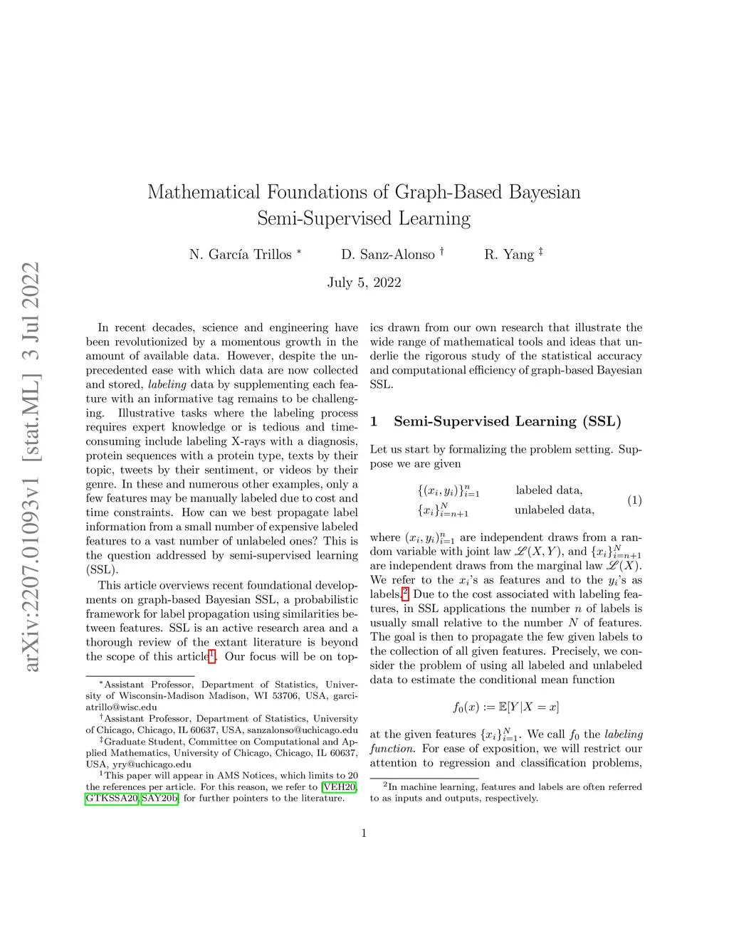 In recent decades, science and engineering have been revolutionized by a momentous growth in the amount of available data. However, despite the unprecedented ease with which data are now collected and stored, labeling data by supplementing each feature with an informative tag remains to be challenging. Illustrative tasks where the labeling process requires expert knowledge or is tedious and time-consuming include labeling X-rays with a diagnosis, protein sequences with a protein type, texts by their topic, tweets by their sentiment, or videos by their genre. In these and numerous other examples, only a few features may be manually labeled due to cost and time constraints. How can we best propagate label information from a small number of expensive labeled features to a vast number of unlabeled ones? This is the question addressed by semi-supervised learning (SSL). This article overviews recent foundational developments on graph-based Bayesian SSL, a probabilistic framework for label propagation using similarities between features. SSL is an active research area and a thorough review of the extant literature is beyond the scope of this article. Our focus will be on topics drawn from our own research that illustrate the wide range of mathematical tools and ideas that underlie the rigorous study of the statistical accuracy and computational efficiency of graph-based Bayesian SSL.