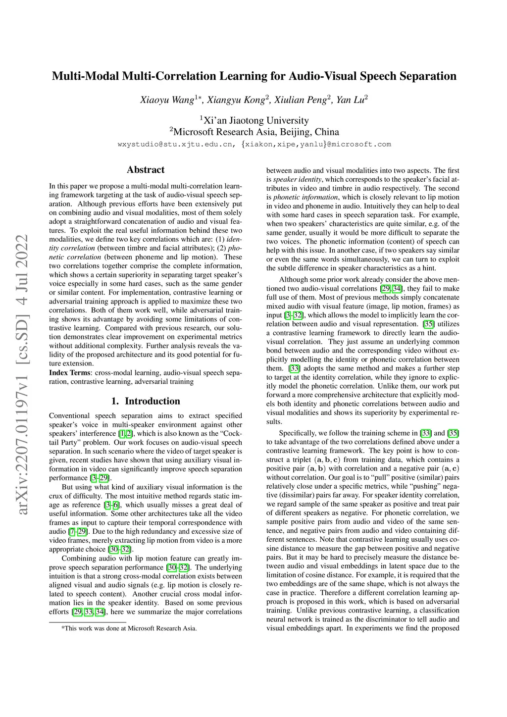 In this paper we propose a multi-modal multi-correlation learning framework targeting at the task of audio-visual speech separation. Although previous efforts have been extensively put on combining audio and visual modalities, most of them solely adopt a straightforward concatenation of audio and visual features. To exploit the real useful information behind these two modalities, we define two key correlations which are: (1) identity correlation (between timbre and facial attributes); (2) phonetic correlation (between phoneme and lip motion). These two correlations together comprise the complete information, which shows a certain superiority in separating target speaker's voice especially in some hard cases, such as the same gender or similar content. For implementation, contrastive learning or adversarial training approach is applied to maximize these two correlations. Both of them work well, while adversarial training shows its advantage by avoiding some limitations of contrastive learning. Compared with previous research, our solution demonstrates clear improvement on experimental metrics without additional complexity. Further analysis reveals the validity of the proposed architecture and its good potential for future extension.
