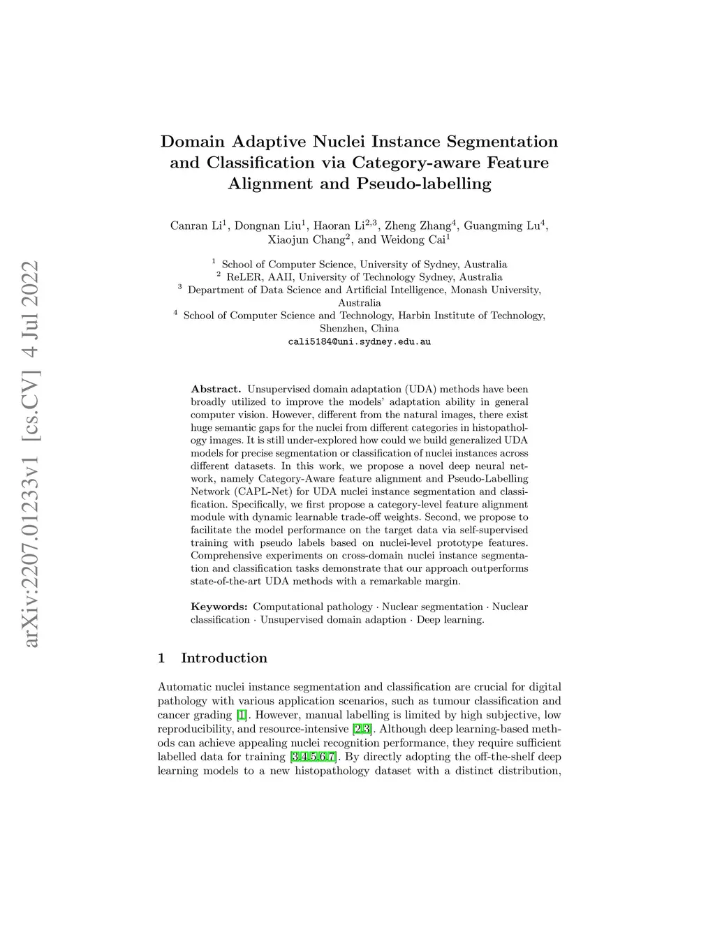 Unsupervised domain adaptation (UDA) methods have been broadly utilized to improve the models' adaptation ability in general computer vision. However, different from the natural images, there exist huge semantic gaps for the nuclei from different categories in histopathology images. It is still under-explored how could we build generalized UDA models for precise segmentation or classification of nuclei instances across different datasets. In this work, we propose a novel deep neural network, namely Category-Aware feature alignment and Pseudo-Labelling Network (CAPL-Net) for UDA nuclei instance segmentation and classification. Specifically, we first propose a category-level feature alignment module with dynamic learnable trade-off weights. Second, we propose to facilitate the model performance on the target data via self-supervised training with pseudo labels based on nuclei-level prototype features. Comprehensive experiments on cross-domain nuclei instance segmentation and classification tasks demonstrate that our approach outperforms state-of-the-art UDA methods with a remarkable margin.