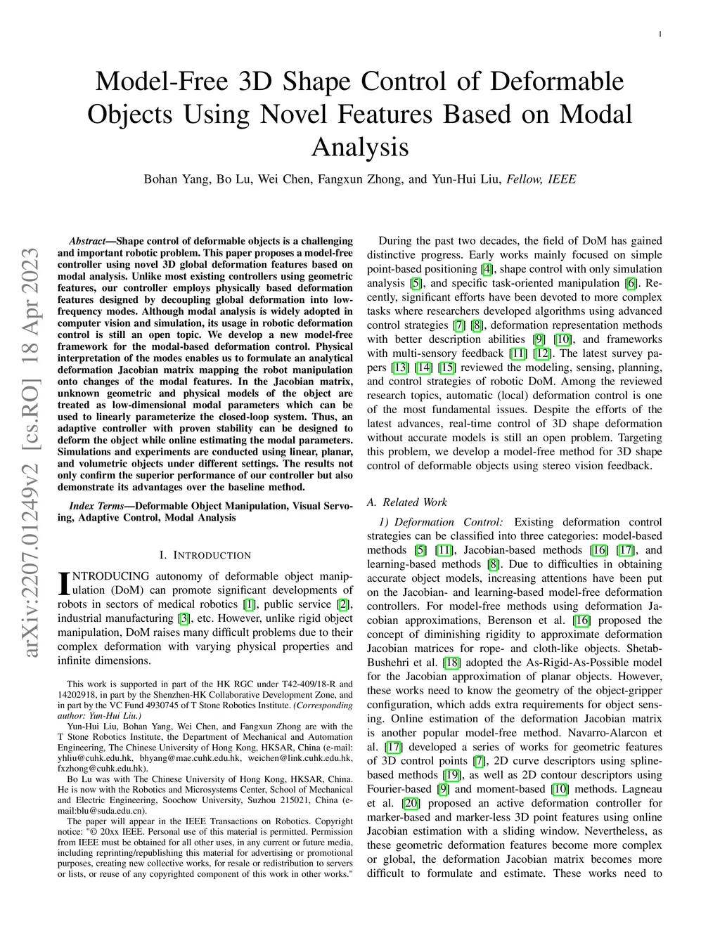 Model-Free 3D Shape Control of Deformable Objects Using Novel Features