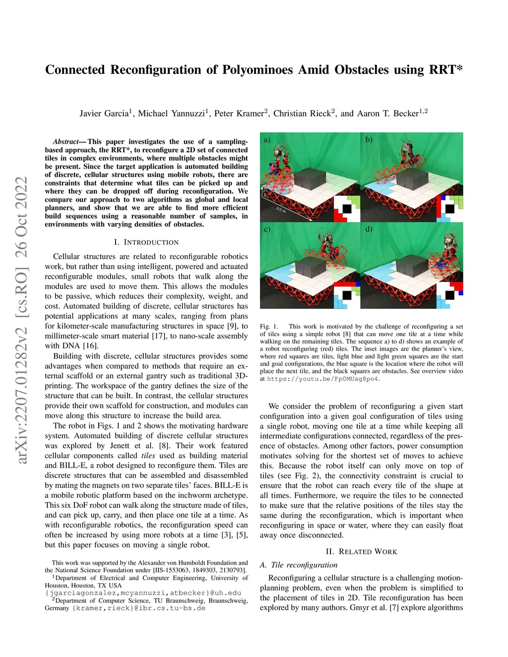 This paper investigates the use of a sampling-based approach, the RRT*, to reconfigure a 2D set of connected tiles in complex environments, where multiple obstacles might be present. Since the target application is automated building of discrete, cellular structures using mobile robots, there are constraints that determine what tiles can be picked up and where they can be dropped off during reconfiguration. We compare our approach to two algorithms as global and local planners, and show that we are able to find more efficient build sequences using a reasonable number of samples, in environments with varying densities of obstacles.