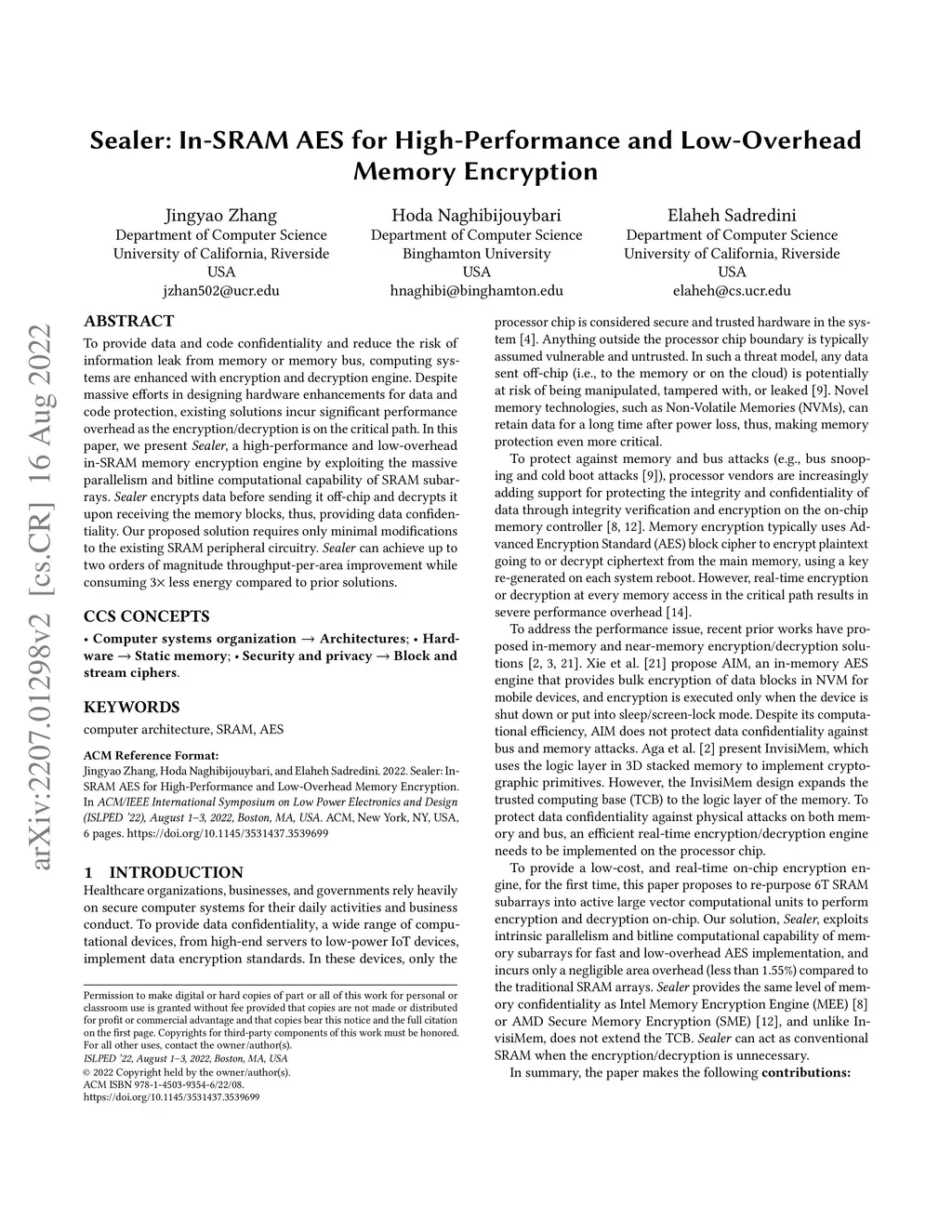 Sealer: In-SRAM AES for High-Performance and Low-Overhead Memory