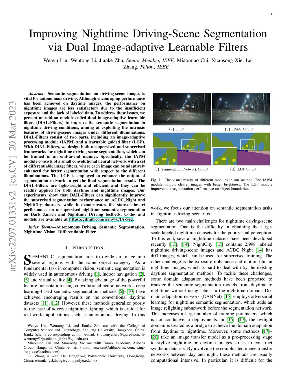 Semantic segmentation on driving-scene images is vital for autonomous driving. Although encouraging performance has been achieved on daytime images, the performance on nighttime images are less satisfactory due to the insufficient exposure and the lack of labeled data. To address these issues, we present an add-on module called dual image-adaptive learnable filters (DIAL-Filters) to improve the semantic segmentation in nighttime driving conditions, aiming at exploiting the intrinsic features of driving-scene images under different illuminations. DIAL-Filters consist of two parts, including an image-adaptive processing module (IAPM) and a learnable guided filter (LGF). With DIAL-Filters, we design both unsupervised and supervised frameworks for nighttime driving-scene segmentation, which can be trained in an end-to-end manner. Specifically, the IAPM module consists of a small convolutional neural network with a set of differentiable image filters, where each image can be adaptively enhanced for better segmentation with respect to the different illuminations. The LGF is employed to enhance the output of segmentation network to get the final segmentation result. The DIAL-Filters are light-weight and efficient and they can be readily applied for both daytime and nighttime images. Our experiments show that DAIL-Filters can significantly improve the supervised segmentation performance on ACDC_Night and NightCity datasets, while it demonstrates the state-of-the-art performance on unsupervised nighttime semantic segmentation on Dark Zurich and Nighttime Driving testbeds.