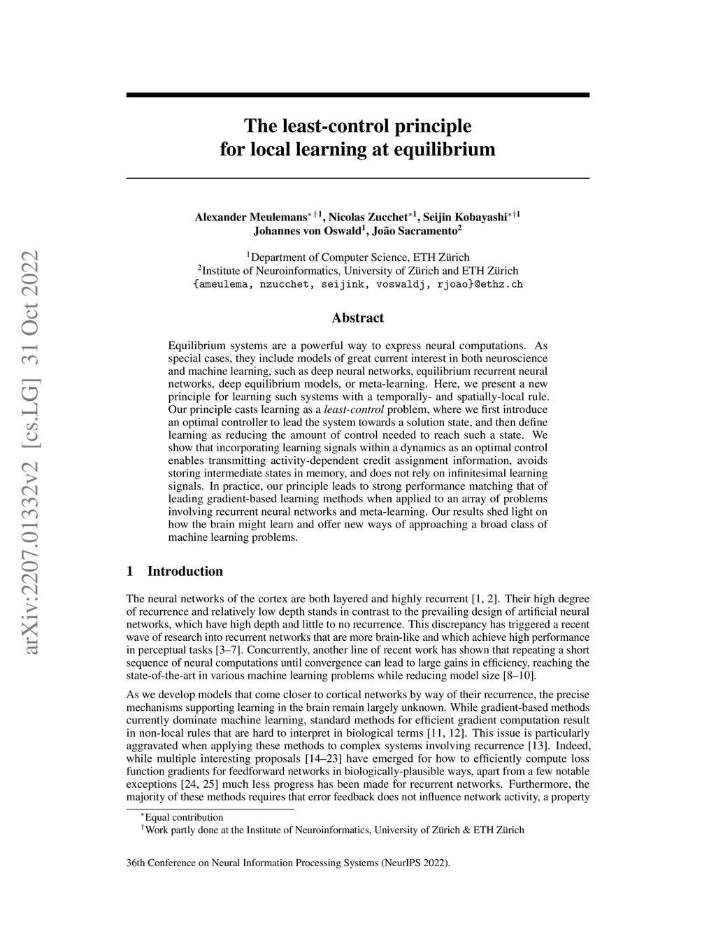 Equilibrium systems are a powerful way to express neural computations. As special cases, they include models of great current interest in both neuroscience and machine learning, such as deep neural networks, equilibrium recurrent neural networks, deep equilibrium models, or meta-learning. Here, we present a new principle for learning such systems with a temporally- and spatially-local rule. Our principle casts learning as a least-control problem, where we first introduce an optimal controller to lead the system towards a solution state, and then define learning as reducing the amount of control needed to reach such a state. We show that incorporating learning signals within a dynamics as an optimal control enables transmitting activity-dependent credit assignment information, avoids storing intermediate states in memory, and does not rely on infinitesimal learning signals. In practice, our principle leads to strong performance matching that of leading gradient-based learning methods when applied to an array of problems involving recurrent neural networks and meta-learning. Our results shed light on how the brain might learn and offer new ways of approaching a broad class of machine learning problems.
