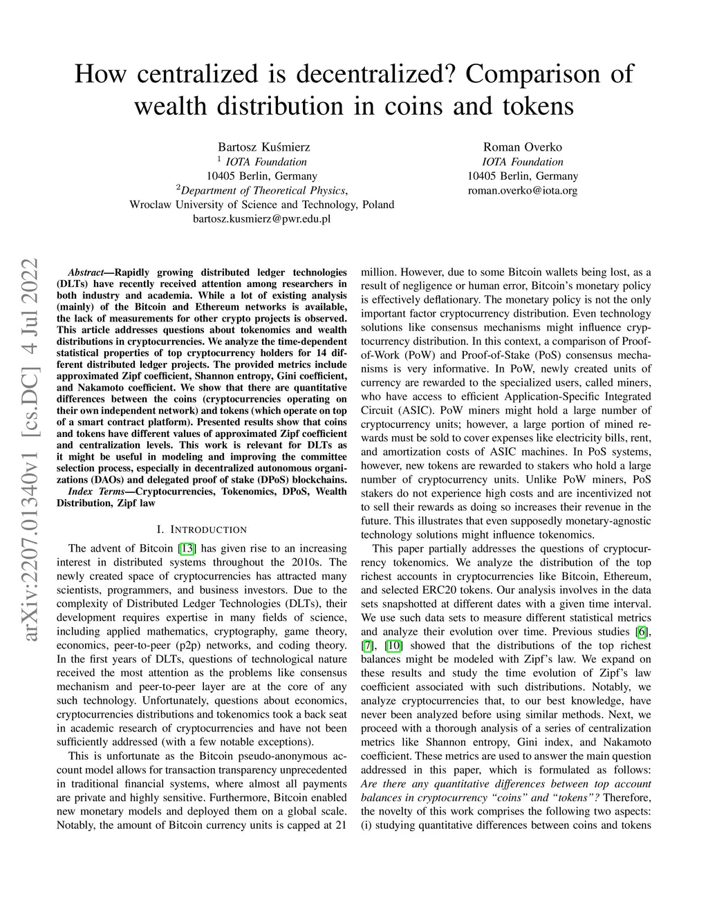 Rapidly growing distributed ledger technologies (DLTs) have recently received attention among researchers in both industry and academia. While a lot of existing analysis (mainly) of the Bitcoin and Ethereum networks is available, the lack of measurements for other crypto projects is observed. This article addresses questions about tokenomics and wealth distributions in cryptocurrencies. We analyze the time-dependent statistical properties of top cryptocurrency holders for 14 different distributed ledger projects. The provided metrics include approximated Zipf coefficient, Shannon entropy, Gini coefficient, and Nakamoto coefficient. We show that there are quantitative differences between the coins (cryptocurrencies operating on their own independent network) and tokens (which operate on top of a smart contract platform). Presented results show that coins and tokens have different values of approximated Zipf coefficient and centralization levels. This work is relevant for DLTs as it might be useful in modeling and improving the committee selection process, especially in decentralized autonomous organizations (DAOs) and delegated proof of stake (DPoS) blockchains.