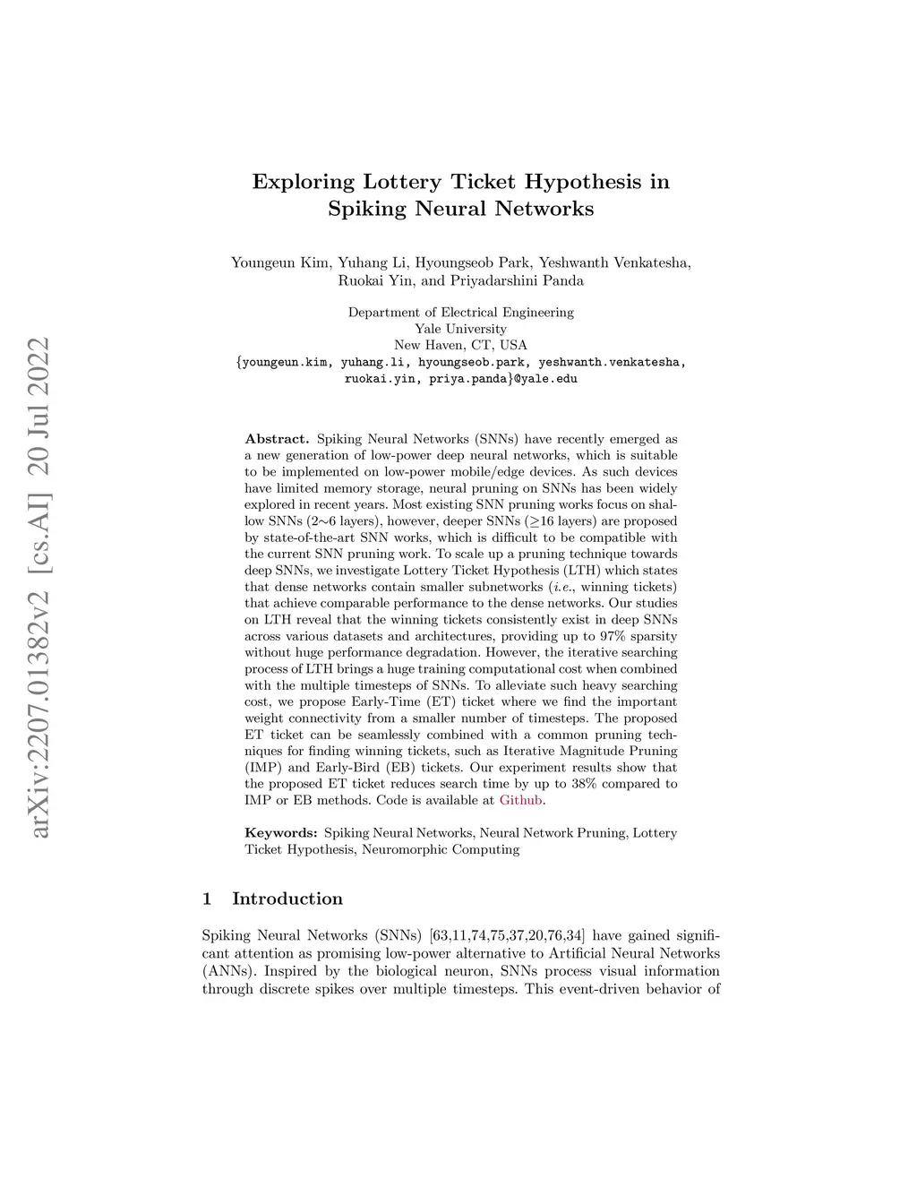 Spiking Neural Networks (SNNs) have recently emerged as a new generation of low-power deep neural networks, which is suitable to be implemented on low-power mobile/edge devices. As such devices have limited memory storage, neural pruning on SNNs has been widely explored in recent years. Most existing SNN pruning works focus on shallow SNNs (2~6 layers), however, deeper SNNs (>16 layers) are proposed by state-of-the-art SNN works, which is difficult to be compatible with the current SNN pruning work. To scale up a pruning technique towards deep SNNs, we investigate Lottery Ticket Hypothesis (LTH) which states that dense networks contain smaller subnetworks (i.e., winning tickets) that achieve comparable performance to the dense networks. Our studies on LTH reveal that the winning tickets consistently exist in deep SNNs across various datasets and architectures, providing up to 97% sparsity without huge performance degradation. However, the iterative searching process of LTH brings a huge training computational cost when combined with the multiple timesteps of SNNs. To alleviate such heavy searching cost, we propose Early-Time (ET) ticket where we find the important weight connectivity from a smaller number of timesteps. The proposed ET ticket can be seamlessly combined with a common pruning techniques for finding winning tickets, such as Iterative Magnitude Pruning (IMP) and Early-Bird (EB) tickets. Our experiment results show that the proposed ET ticket reduces search time by up to 38% compared to IMP or EB methods. Code is available at Github.