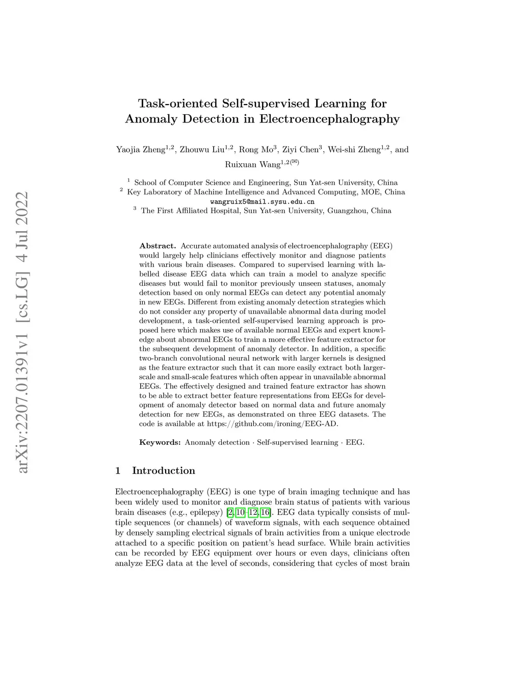 Accurate automated analysis of electroencephalography (EEG) would largely help clinicians effectively monitor and diagnose patients with various brain diseases. Compared to supervised learning with labelled disease EEG data which can train a model to analyze specific diseases but would fail to monitor previously unseen statuses, anomaly detection based on only normal EEGs can detect any potential anomaly in new EEGs. Different from existing anomaly detection strategies which do not consider any property of unavailable abnormal data during model development, a task-oriented self-supervised learning approach is proposed here which makes use of available normal EEGs and expert knowledge about abnormal EEGs to train a more effective feature extractor for the subsequent development of anomaly detector. In addition, a specific two branch convolutional neural network with larger kernels is designed as the feature extractor such that it can more easily extract both larger scale and small-scale features which often appear in unavailable abnormal EEGs. The effectively designed and trained feature extractor has shown to be able to extract better feature representations from EEGs for development of anomaly detector based on normal data and future anomaly detection for new EEGs, as demonstrated on three EEG datasets. The code is available at https://github.com/ironing/EEG-AD.