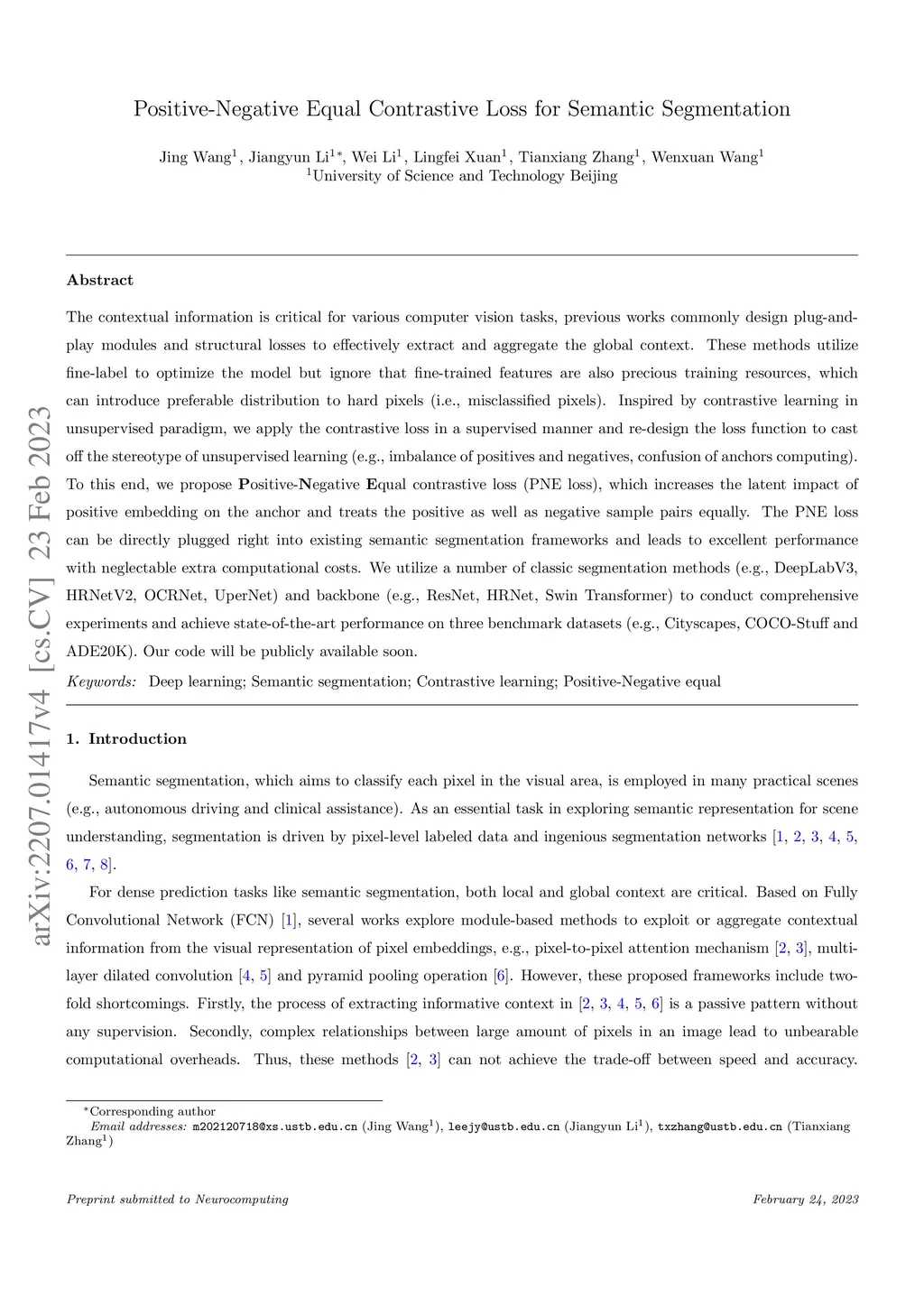 Positive-Negative Equal Contrastive Loss for Semantic Segmentation