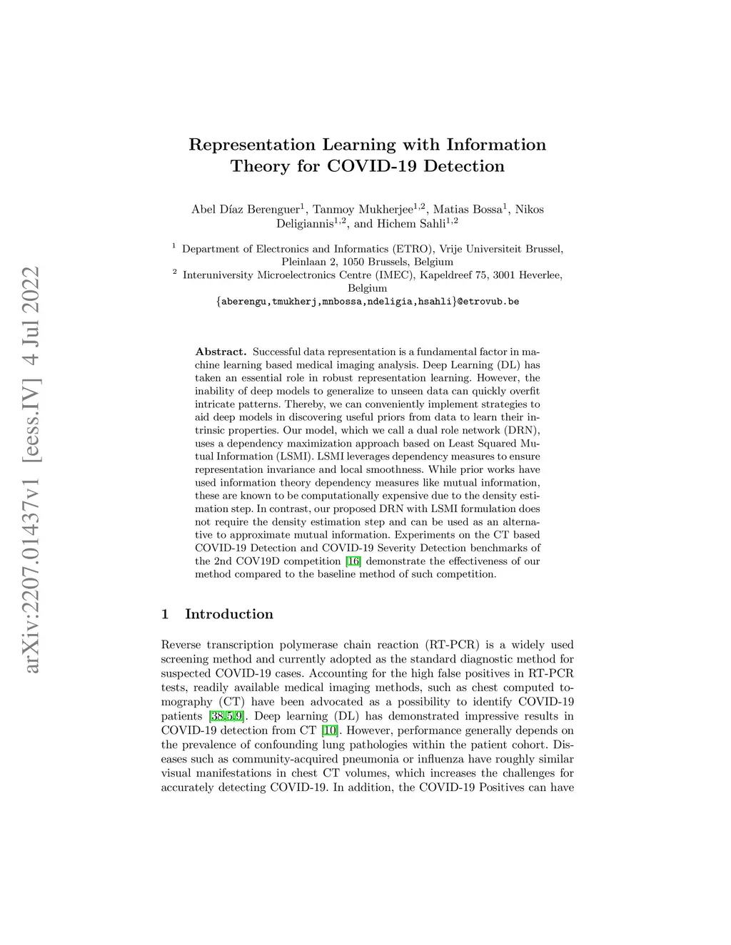 Successful data representation is a fundamental factor in machine learning based medical imaging analysis. Deep Learning (DL) has taken an essential role in robust representation learning. However, the inability of deep models to generalize to unseen data can quickly overfit intricate patterns. Thereby, we can conveniently implement strategies to aid deep models in discovering useful priors from data to learn their intrinsic properties. Our model, which we call a dual role network (DRN), uses a dependency maximization approach based on Least Squared Mutual Information (LSMI). The LSMI leverages dependency measures to ensure representation invariance and local smoothness. While prior works have used information theory measures like mutual information, known to be computationally expensive due to a density estimation step, our LSMI formulation alleviates the issues of intractable mutual information estimation and can be used to approximate it. Experiments on CT based COVID-19 Detection and COVID-19 Severity Detection benchmarks demonstrate the effectiveness of our method.