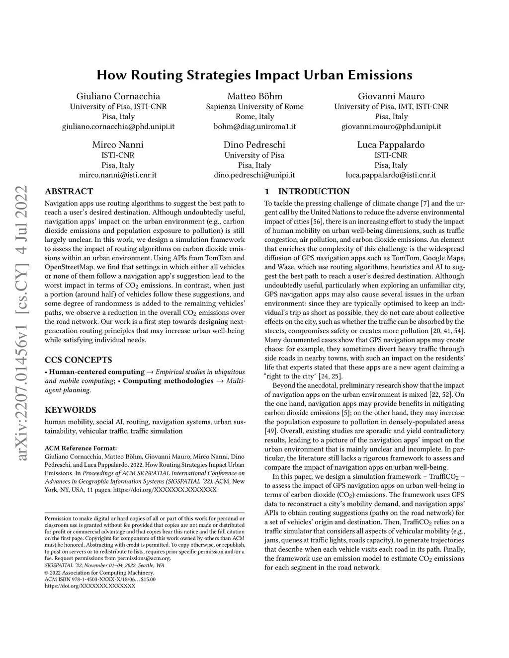 Navigation apps use routing algorithms to suggest the best path to reach a user's desired destination. Although undoubtedly useful, navigation apps' impact on the urban environment (e.g., carbon dioxide emissions and population exposure to pollution) is still largely unclear. In this work, we design a simulation framework to assess the impact of routing algorithms on carbon dioxide emissions within an urban environment. Using APIs from TomTom and OpenStreetMap, we find that settings in which either all vehicles or none of them follow a navigation app's suggestion lead to the worst impact in terms of CO2 emissions. In contrast, when just a portion (around half) of vehicles follow these suggestions, and some degree of randomness is added to the remaining vehicles' paths, we observe a reduction in the overall CO2 emissions over the road network. Our work is a first step towards designing next-generation routing principles that may increase urban well-being while satisfying individual needs.