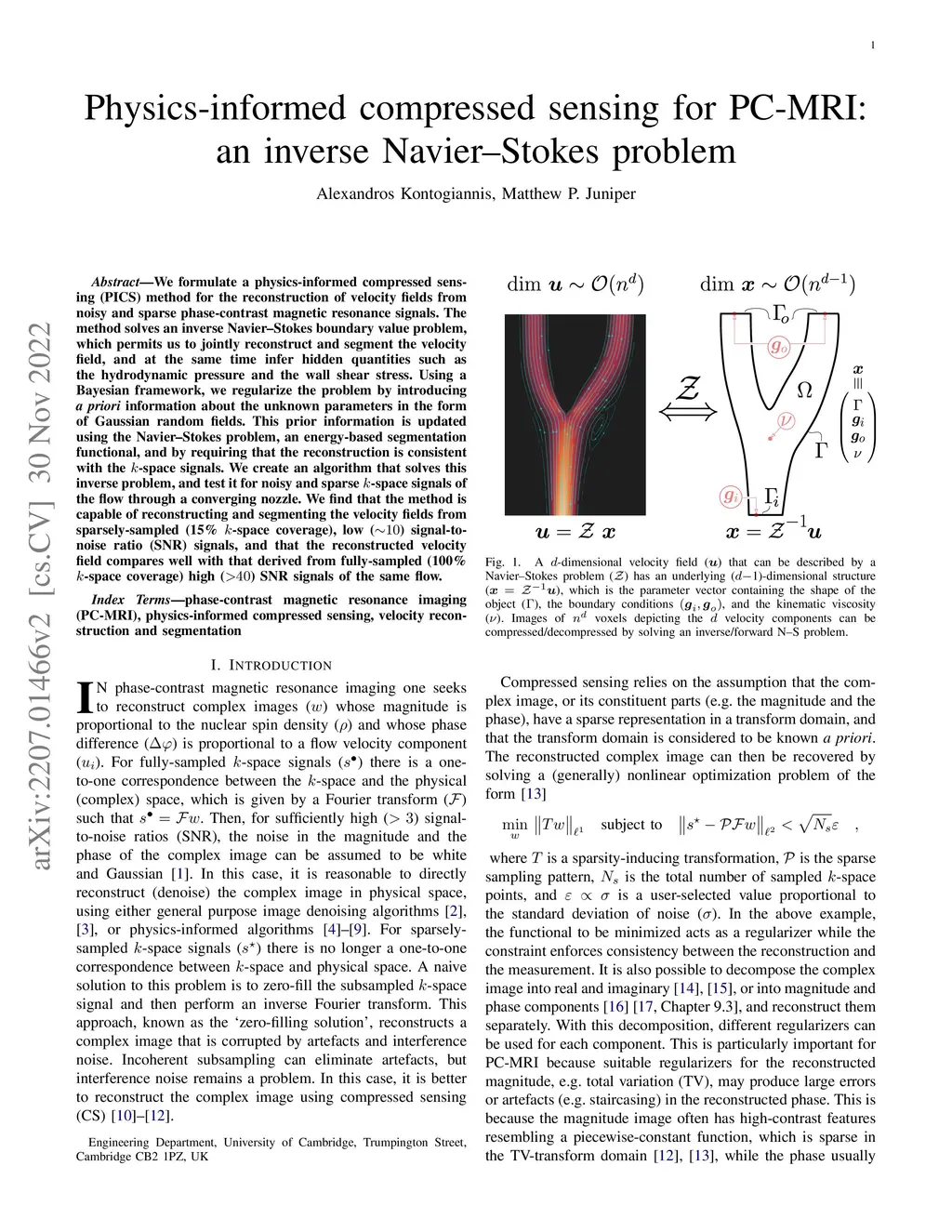 We formulate a physics-informed compressed sensing (PICS) method for the reconstruction of velocity fields from noisy and sparse phase-contrast magnetic resonance signals. The method solves an inverse Navier-Stokes boundary value problem, which permits us to jointly reconstruct and segment the velocity field, and at the same time infer hidden quantities such as the hydrodynamic pressure and the wall shear stress. Using a Bayesian framework, we regularize the problem by introducing a priori information about the unknown parameters in the form of Gaussian random fields. This prior information is updated using the Navier-Stokes problem, an energy-based segmentation functional, and by requiring that the reconstruction is consistent with the -space signals. We create an algorithm that solves this reconstruction problem, and test it for noisy and sparse -space signals of the flow through a converging nozzle. We find that the method is capable of reconstructing and segmenting the velocity fields from sparsely-sampled (15% -space coverage), low () signal-to-noise ratio (SNR) signals, and that the reconstructed velocity field compares well with that derived from fully-sampled (100% -space coverage) high () SNR signals of the same flow.