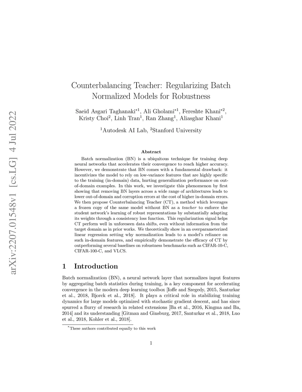Batch normalization (BN) is a ubiquitous technique for training deep neural networks that accelerates their convergence to reach higher accuracy. However, we demonstrate that BN comes with a fundamental drawback: it incentivizes the model to rely on low-variance features that are highly specific to the training (in-domain) data, hurting generalization performance on out-of-domain examples. In this work, we investigate this phenomenon by first showing that removing BN layers across a wide range of architectures leads to lower out-of-domain and corruption errors at the cost of higher in-domain errors. We then propose Counterbalancing Teacher (CT), a method which leverages a frozen copy of the same model without BN as a teacher to enforce the student network's learning of robust representations by substantially adapting its weights through a consistency loss function. This regularization signal helps CT perform well in unforeseen data shifts, even without information from the target domain as in prior works. We theoretically show in an overparameterized linear regression setting why normalization leads to a model's reliance on such in-domain features, and empirically demonstrate the efficacy of CT by outperforming several baselines on robustness benchmarks such as CIFAR-10-C, CIFAR-100-C, and VLCS.